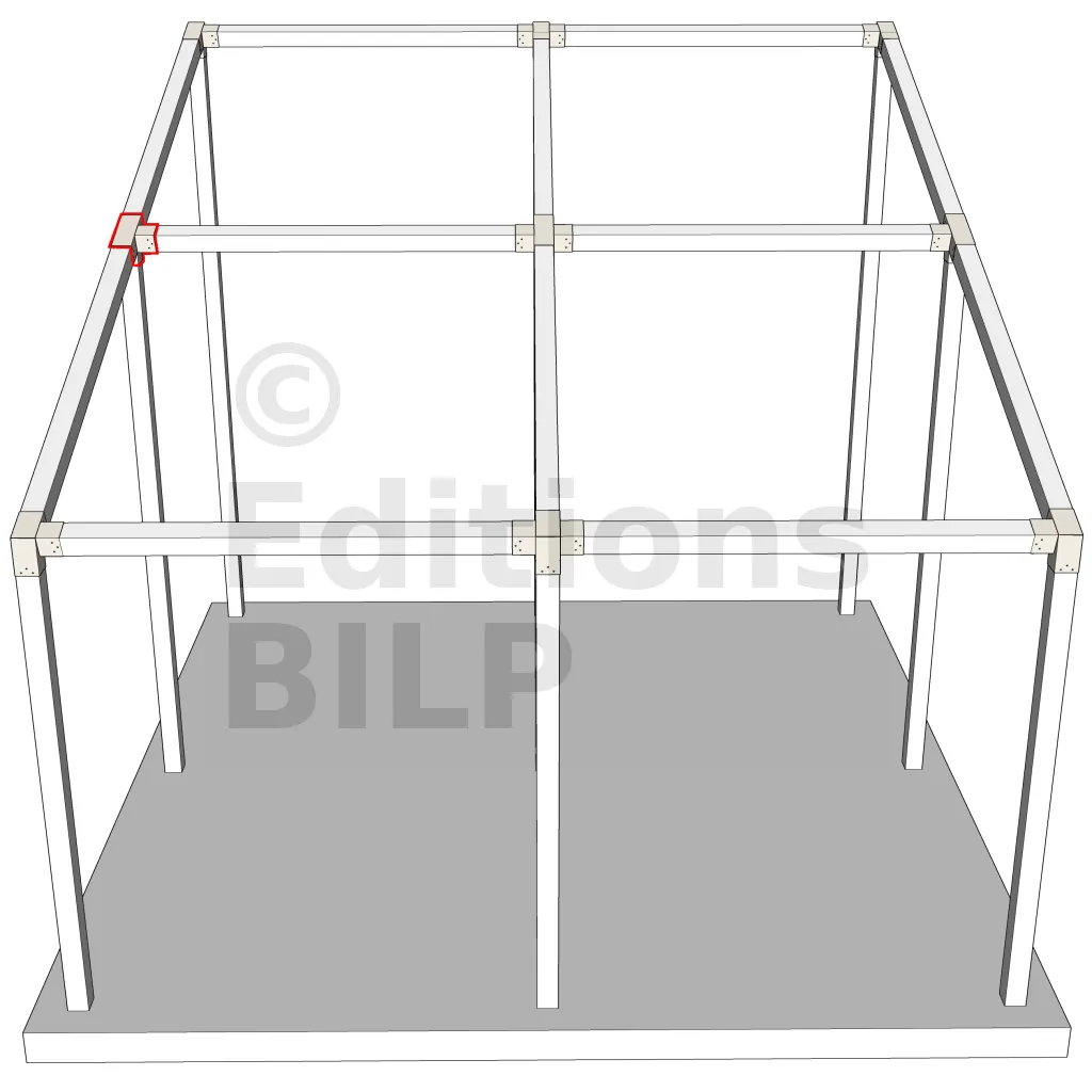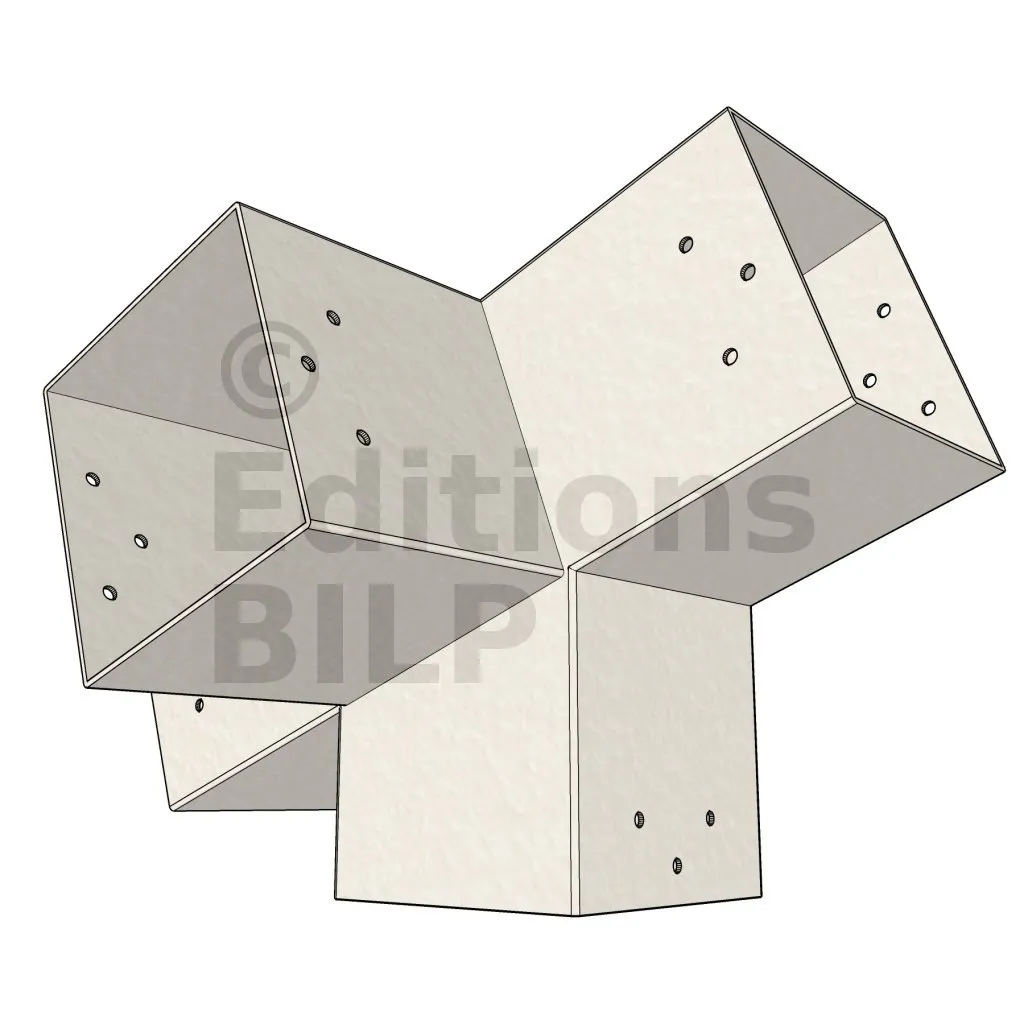 Connecteur d’angle intérieur à quatre directions, conçu pour l’assemblage de deux poutres en section 120x120 mm formant un angle de 20° avec un poteau vertical de même section. Il assure une liaison structurelle rigide et orthogonale à mi-hauteur, garantissant la stabilité de l’ensemble.
