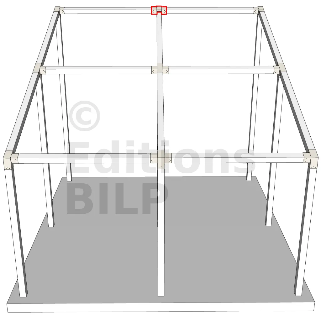 Connecteur d’angle intérieur à quatre directions conçu pour l’assemblage de poutres en section 120x120 mm avec un chevron de même section incliné à 20°. Il assure la jonction structurelle entre les éléments horizontaux, le chevron incliné et un poteau porteur vertical en 120x120 mm.