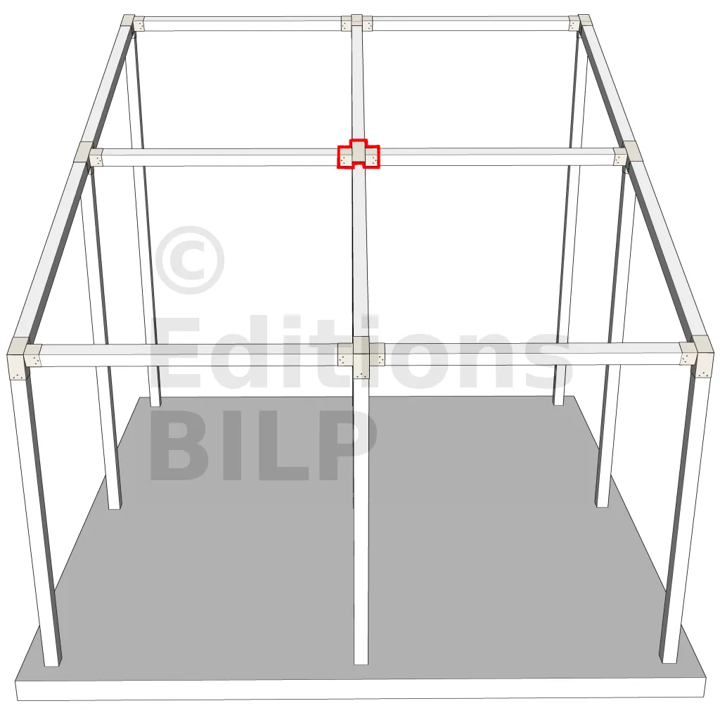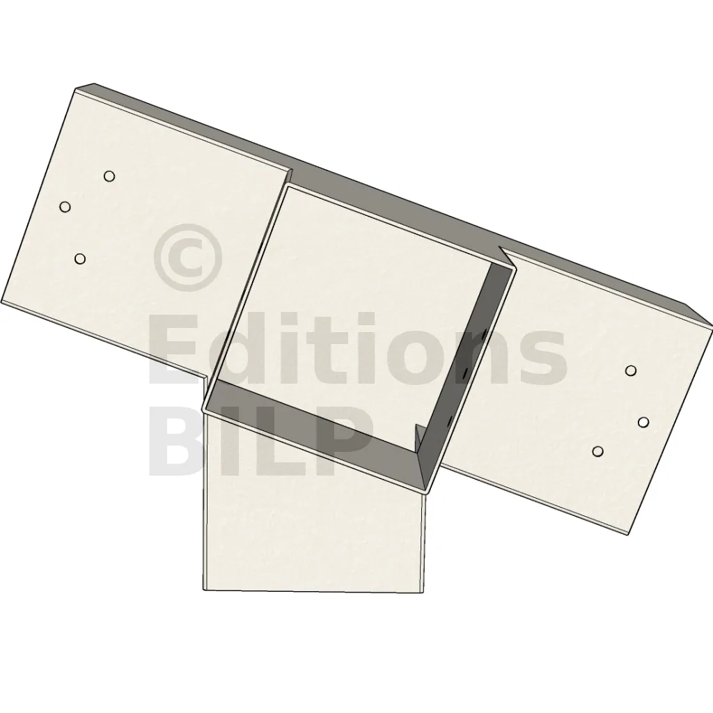 Connecteur métallique permettant l’assemblage précis de deux chevrons inclinés à 20°, de deux poutres horizontales et d’un poteau vertical central, tous de section 120x120 mm. Il garantit une liaison rigide et symétrique en un point central, assurant la stabilité de l’ensemble de la structure.