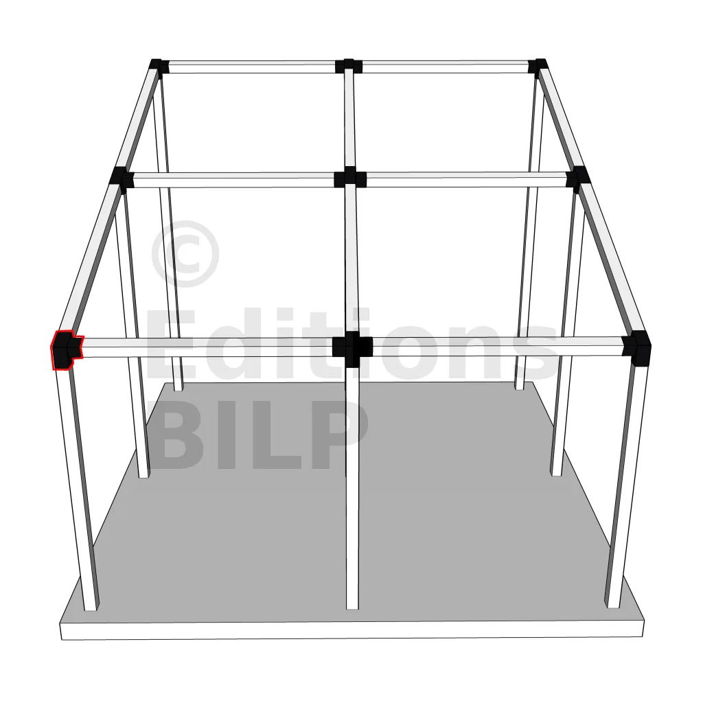 Il est utilisé dans un angle extérieur. Ce connecteur va permettre de raccorder une poutre 120x120mm à une poutre 120x120mm avec une pente de 20°, le tout étant supporté par un poteau vertical 120x120mm.