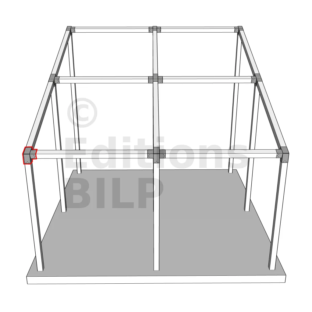 Il est utilisé dans un angle extérieur. Ce connecteur va permettre de raccorder une poutre 120x120mm à une poutre 120x120mm avec une pente de 20°, le tout étant supporté par un poteau vertical 120x120mm.