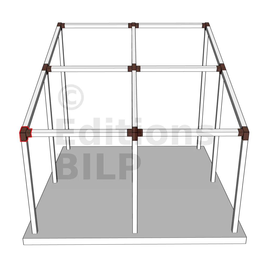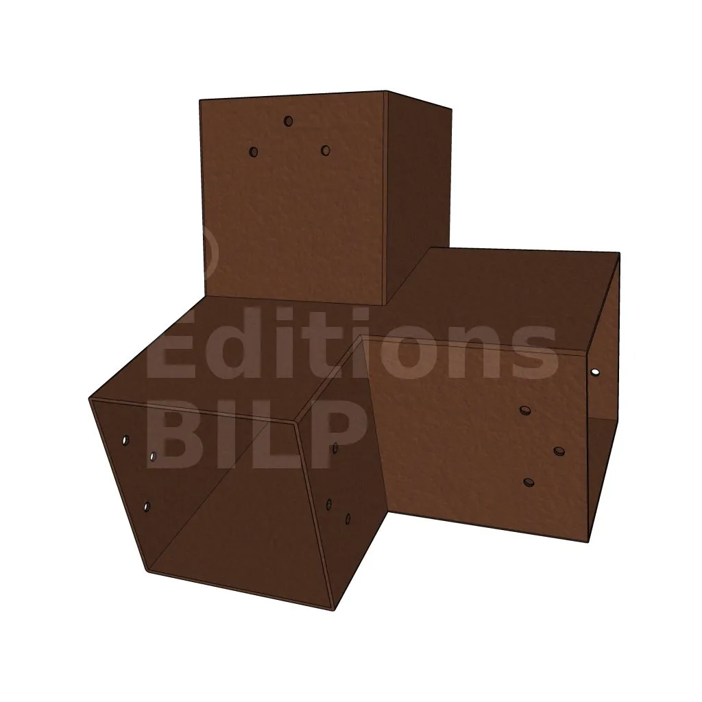 Il est utilisé dans un angle extérieur. Ce connecteur va permettre de raccorder une poutre 120x120mm à une poutre 120x120mm avec une pente de 20°, le tout étant supporté par un poteau vertical 120x120mm.