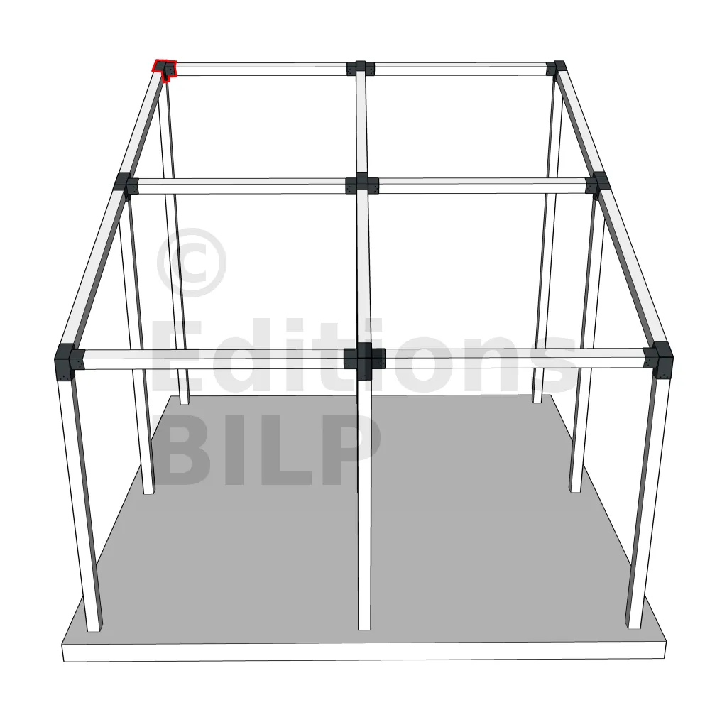 Il est utilisé dans un angle extérieur. Ce connecteur va permettre de raccorder une poutre 120x120mm à une poutre 120x120mm avec une pente de 20°, le tout étant supporté par un poteau vertical 120x120mm.