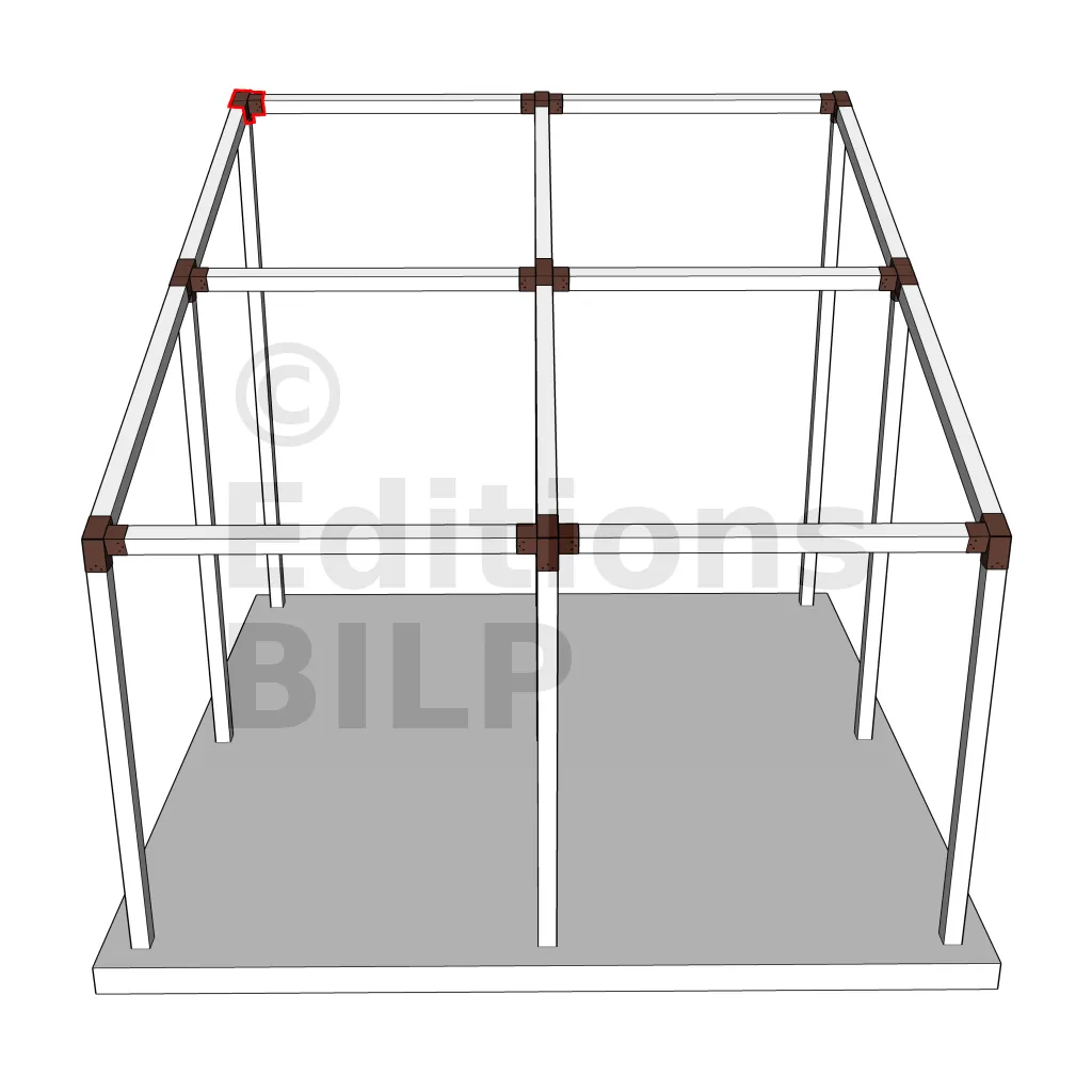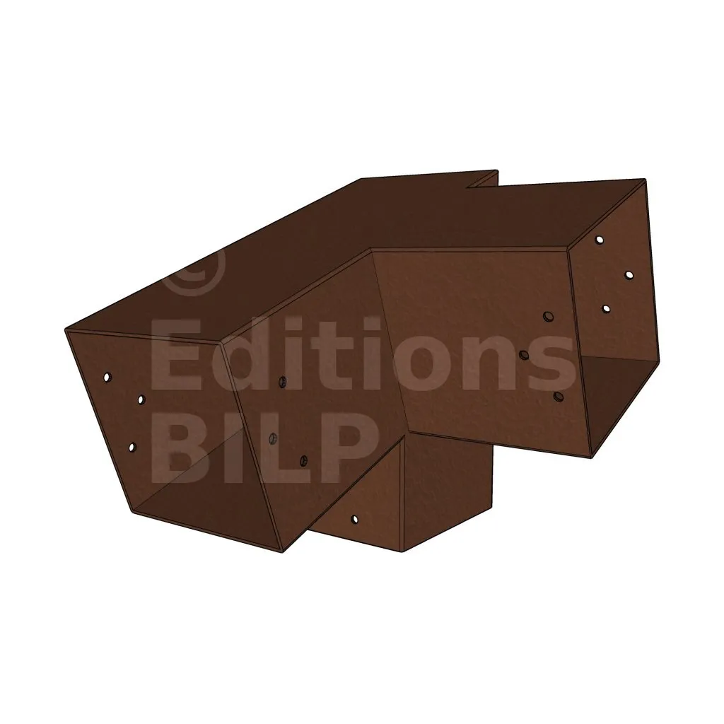 Il est utilisé dans un angle extérieur. Ce connecteur va permettre de raccorder une poutre 120x120mm à une poutre 120x120mm avec une pente de 20°, le tout étant supporté par un poteau vertical 120x120mm.