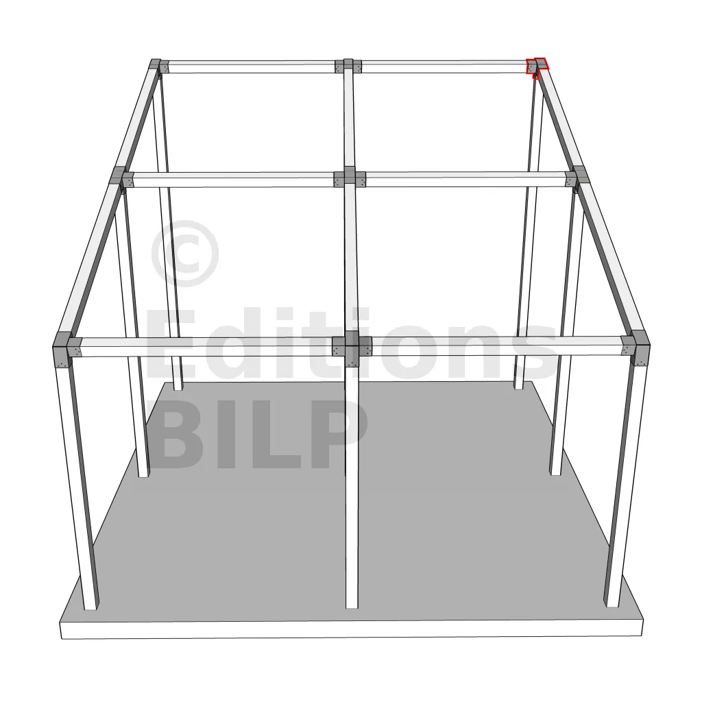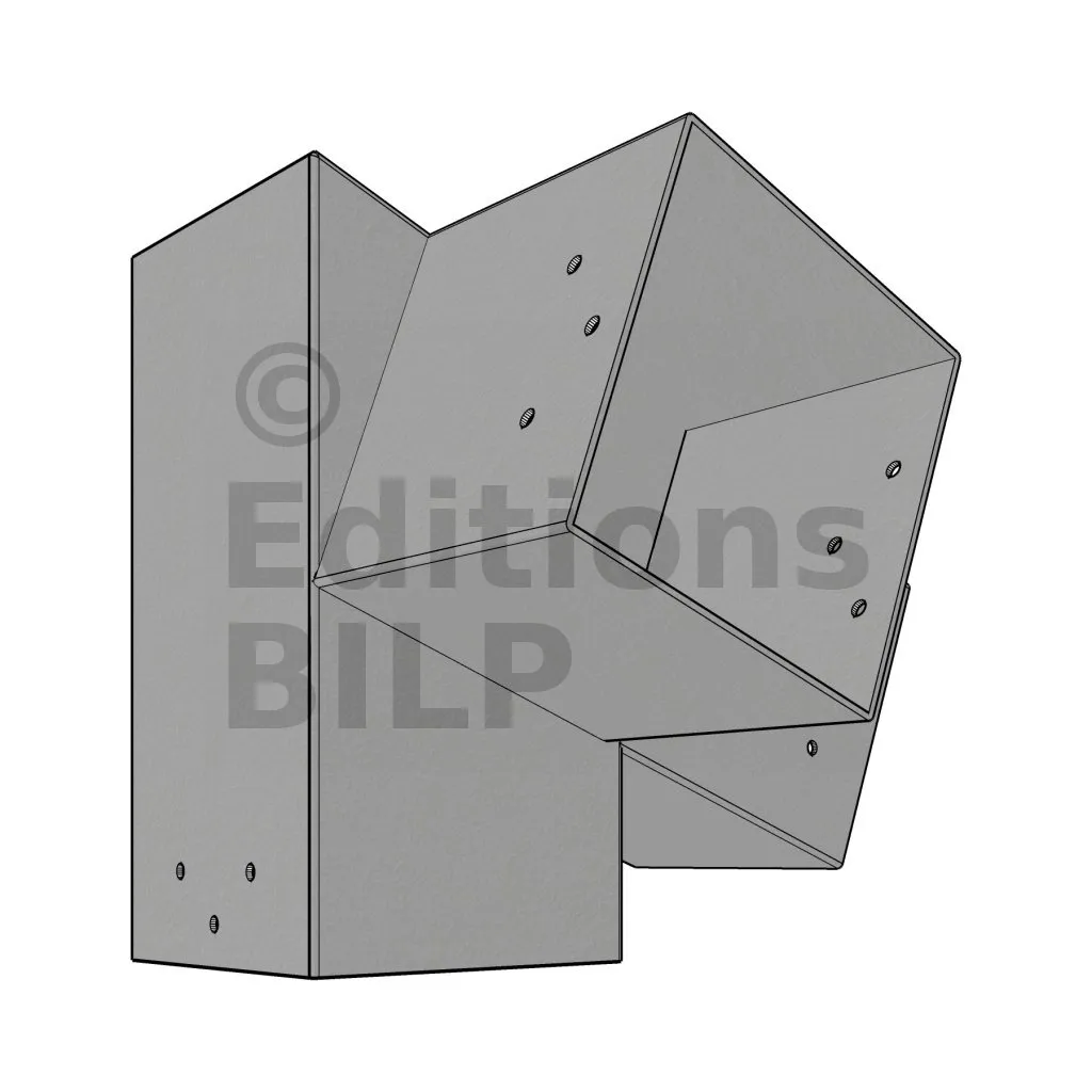 Il est utilisé dans un angle extérieur. Ce connecteur va permettre de raccorder une poutre 120x120mm à une poutre 120x120mm avec une pente de 20°, le tout étant supporté par un poteau vertical 120x120mm.