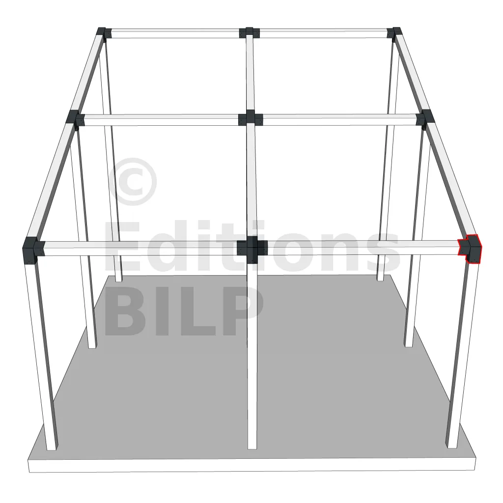 Il est utilisé dans un angle extérieur. Ce connecteur va permettre de raccorder une poutre 120x120mm à une poutre 120x120mm avec une pente de 20°, le tout étant supporté par un poteau vertical 120x120mm.