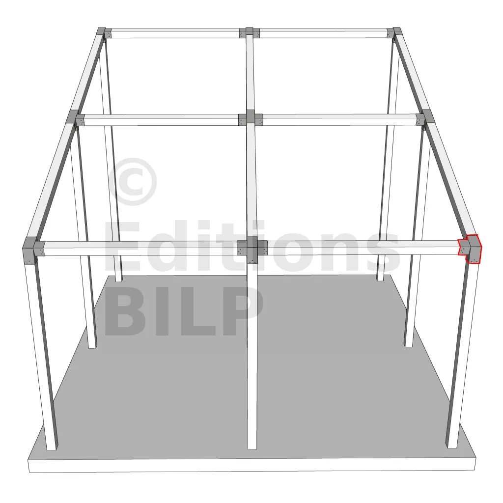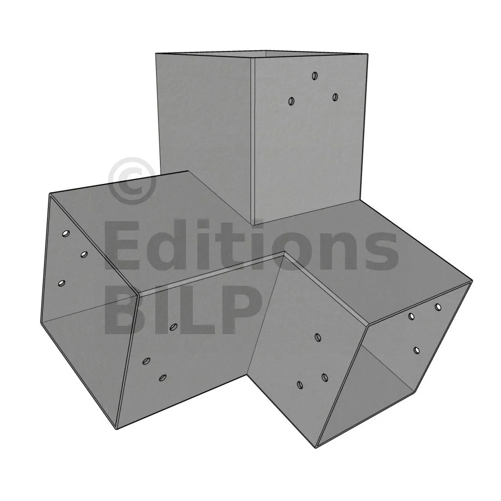 Il est utilisé dans un angle extérieur. Ce connecteur va permettre de raccorder une poutre 120x120mm à une poutre 120x120mm avec une pente de 20°, le tout étant supporté par un poteau vertical 120x120mm.