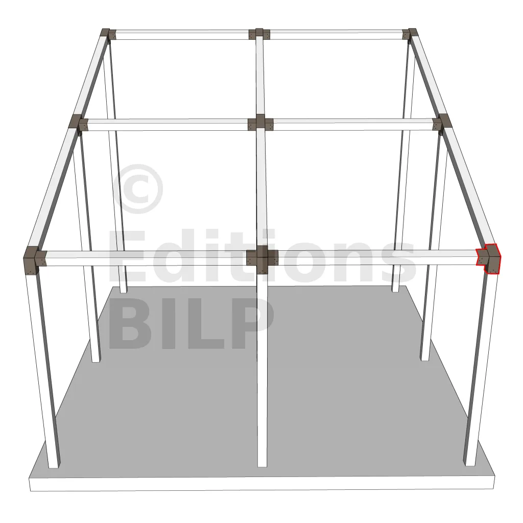 Il est utilisé dans un angle extérieur. Ce connecteur va permettre de raccorder une poutre 120x120mm à une poutre 120x120mm avec une pente de 20°, le tout étant supporté par un poteau vertical 120x120mm.