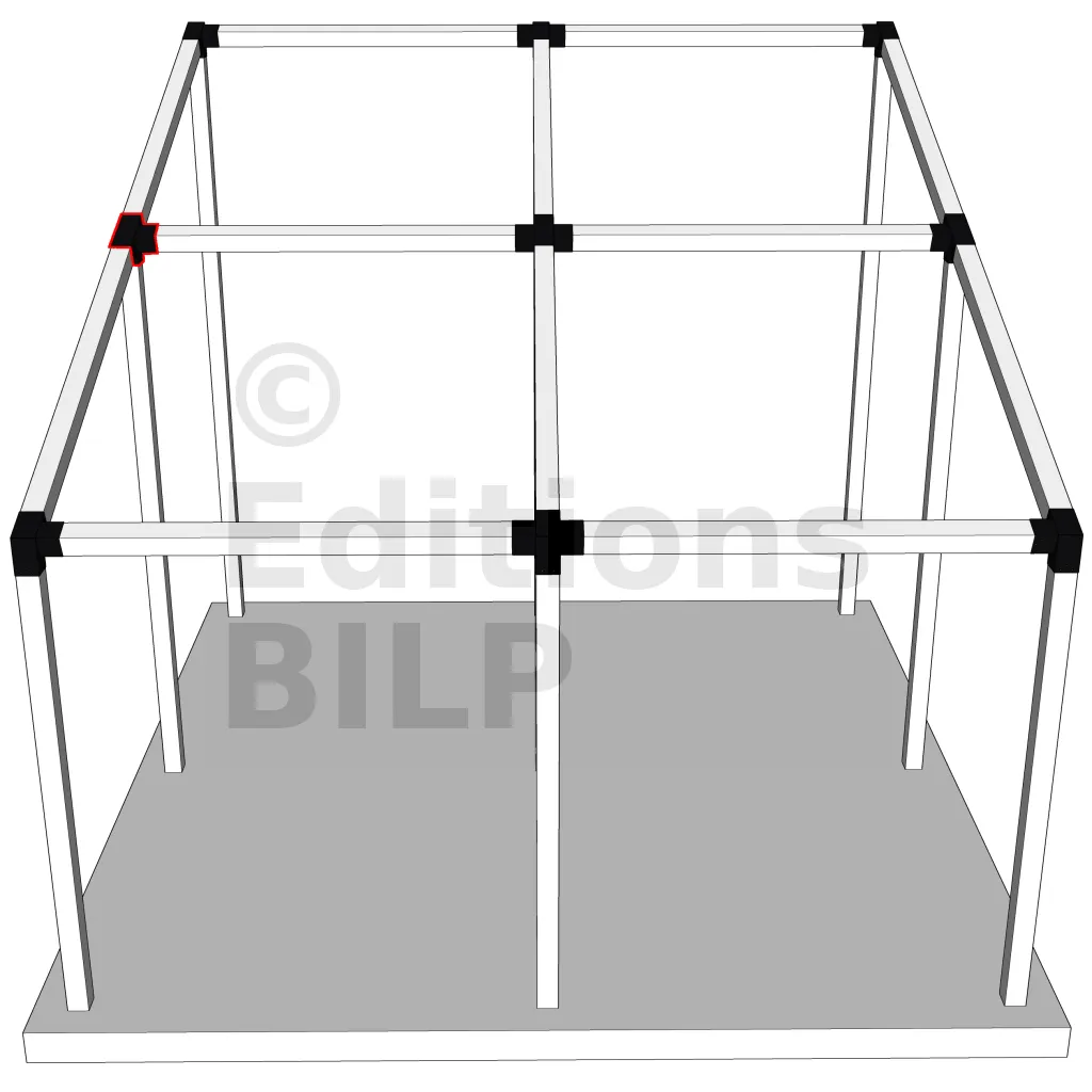 Connecteur d’angle intérieur à quatre directions, conçu pour l’assemblage de deux poutres en section 120x120 mm formant un angle de 20° avec un poteau vertical de même section. Il assure une liaison structurelle rigide et orthogonale à mi-hauteur, garantissant la stabilité de l’ensemble.