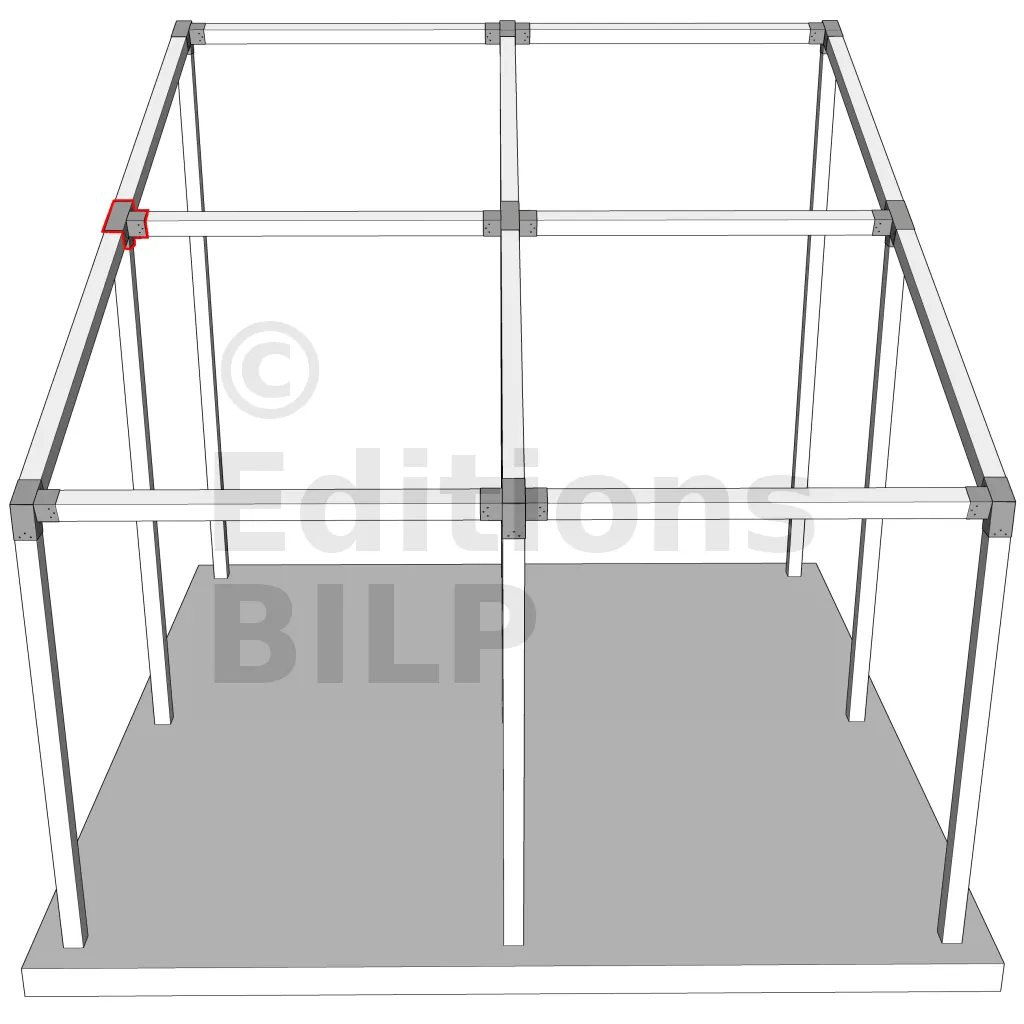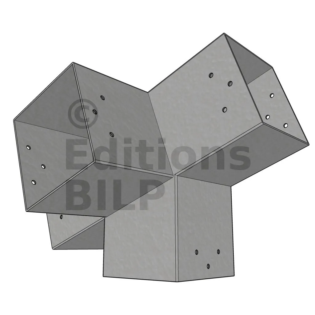 Connecteur d’angle intérieur à quatre directions, conçu pour l’assemblage de deux poutres en section 120x120 mm formant un angle de 20° avec un poteau vertical de même section. Il assure une liaison structurelle rigide et orthogonale à mi-hauteur, garantissant la stabilité de l’ensemble.