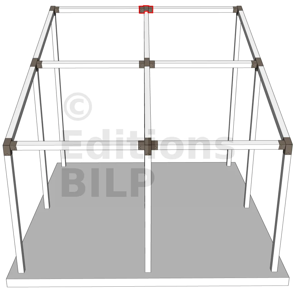 Connecteur d’angle intérieur à quatre directions conçu pour l’assemblage de poutres en section 120x120 mm avec un chevron de même section incliné à 20°. Il assure la jonction structurelle entre les éléments horizontaux, le chevron incliné et un poteau porteur vertical en 120x120 mm.