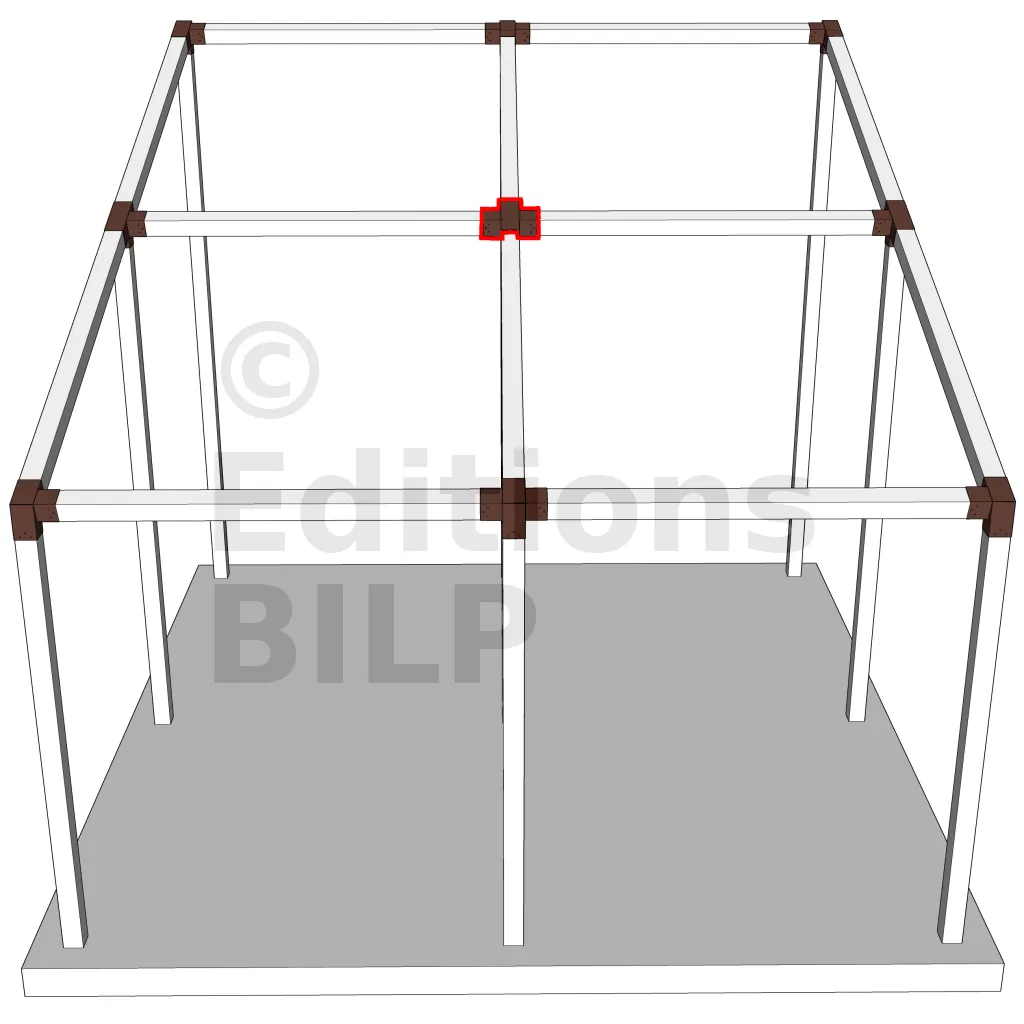 Connecteur métallique permettant l’assemblage précis de deux chevrons inclinés à 20°, de deux poutres horizontales et d’un poteau vertical central, tous de section 120x120 mm. Il garantit une liaison rigide et symétrique en un point central, assurant la stabilité de l’ensemble de la structure.