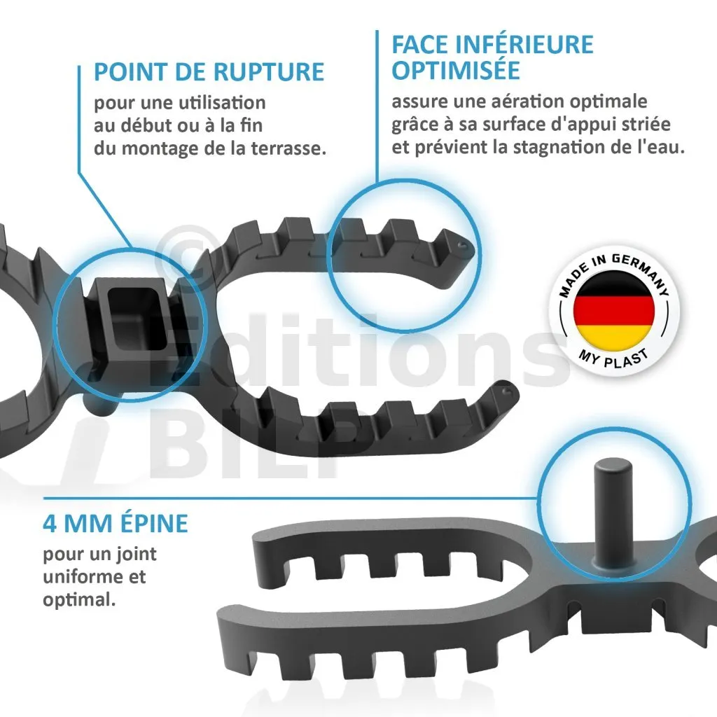 En cas de doute, choisissez les cales de 4 mm : si les lames gonflent jusqu’à se toucher, cela peut provoquer des déformations du bois et endommager la terrasse.