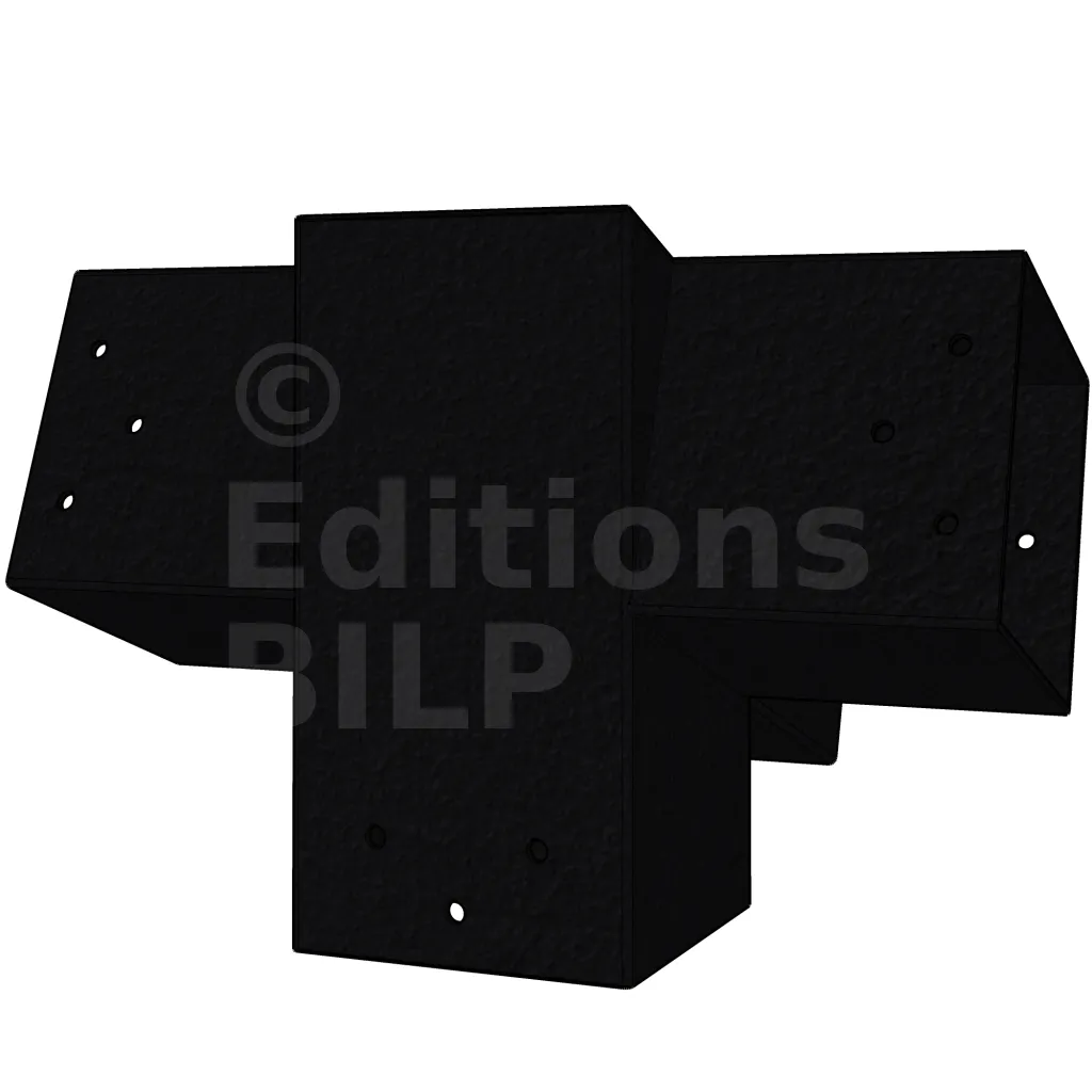 Connecteur d’angle intérieur à quatre directions conçu pour l’assemblage de poutres en section 90x90 mm avec un chevron de même section incliné à 20°. Il assure la jonction structurelle entre les éléments horizontaux, le chevron incliné et un poteau porteur vertical en 90x90 mm.