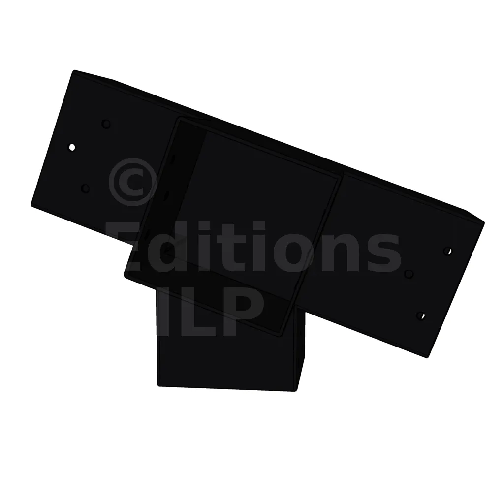 Connecteur d’angle intérieur à quatre directions, conçu pour l’assemblage de deux poutres en section 90x90 mm formant un angle de 20° avec un poteau vertical de même section. Il assure une liaison structurelle rigide et orthogonale à mi-hauteur, garantissant la stabilité de l’ensemble.