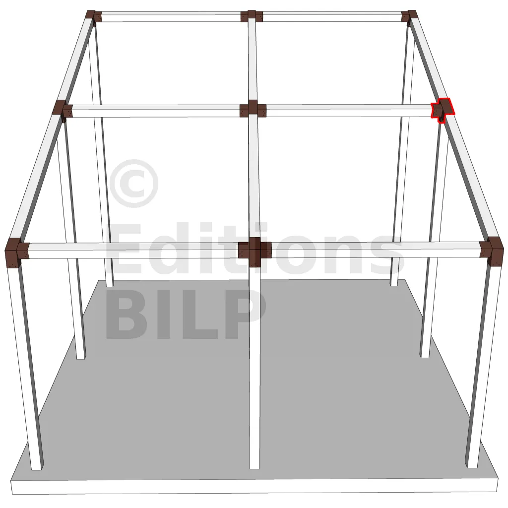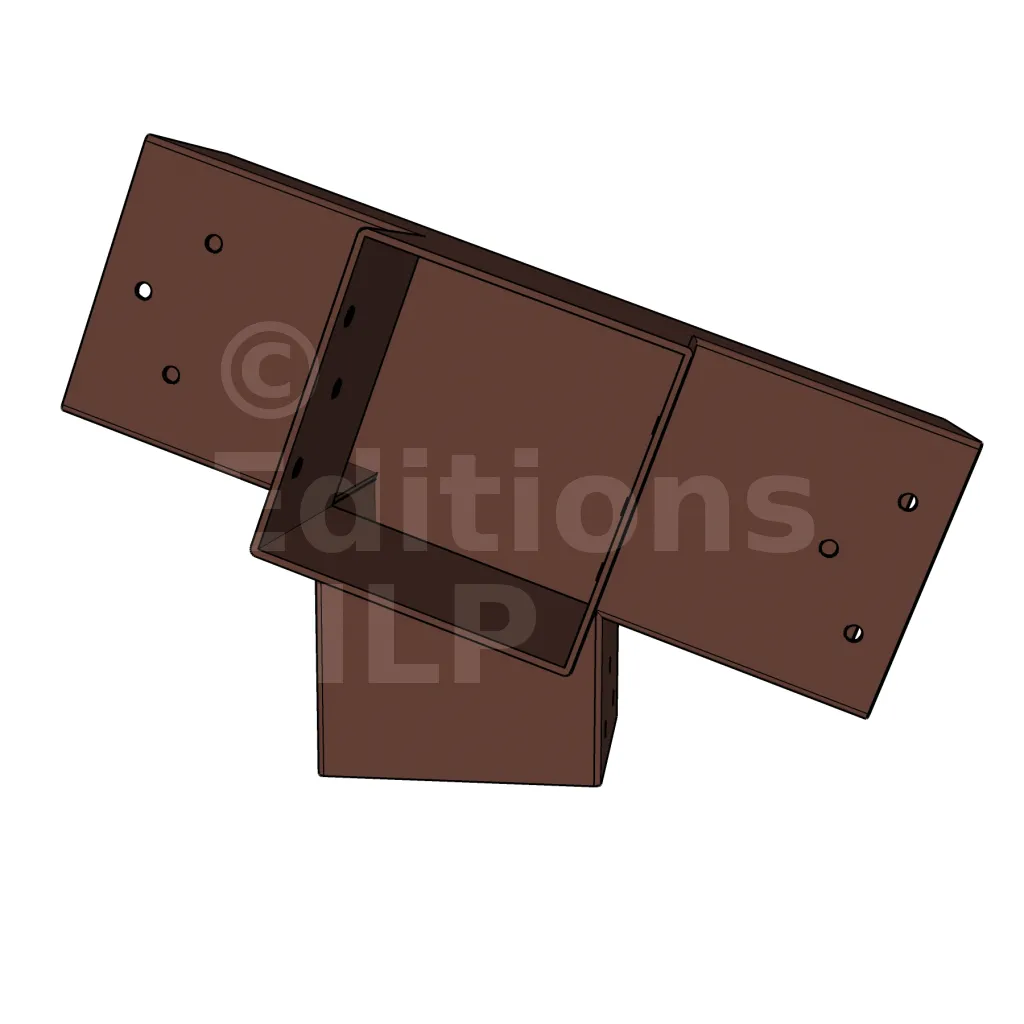 Connecteur d’angle intérieur à quatre directions, conçu pour l’assemblage de deux poutres en section 90x90 mm formant un angle de 20° avec un poteau vertical de même section. Il assure une liaison structurelle rigide et orthogonale à mi-hauteur, garantissant la stabilité de l’ensemble.