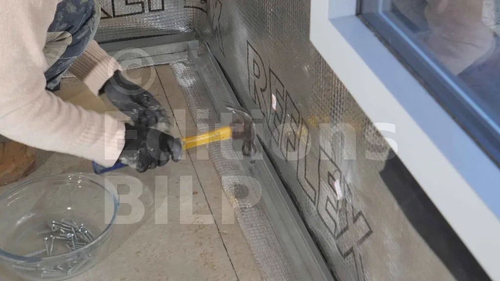 Fixez un montant sur le précadre en bois de la fenêtre. Ce précadre assure l’isolation thermique de la fenêtre, empêchant ainsi la transmission du froid du montant au cadre de la fenêtre.