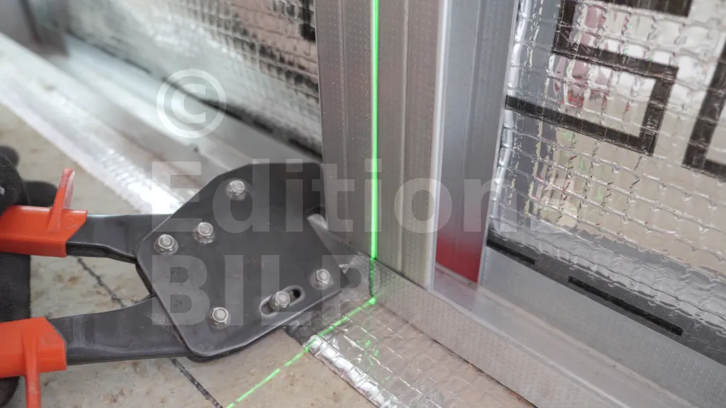 Clipsez les montants entre les rails. Vérifiez et ajustez la verticalité des montants, puis sertissez les deux montants entre eux. Et sertissez-les aux rails avec de la pince à sertir [1].