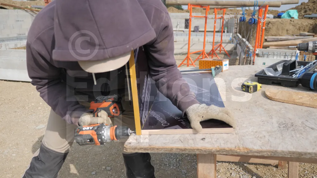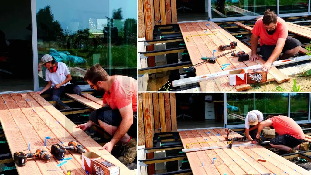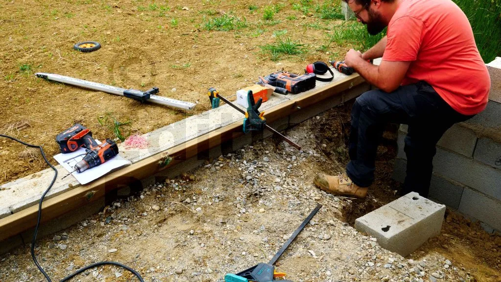 La lambourde périphérique est d’abord positionnée contre le muret en béton en s’aidant d’une mire pour contrôler le niveau sur toute sa longueur et ajuster la hauteur si nécessaire. Une fois la cote validée, la lambourde est maintenue fermement contre le muret à l’aide d’un serre-joint, ce qui évite tout déplacement pendant le traçage et le perçage. Les points de fixation sont repérés puis un pré-perçage est réalisé à travers la lambourde et dans le béton au moyen d’une foreuse adaptée, en respectant le diamètre et la profondeur requis par les vis HECO Multi-Monti TimberConnect. Les vis sont ensuite mises en place et serrées progressivement, de manière à plaquer la lambourde contre le muret sans la déformer. En ce qui concerne la protection des coupes des lambourdes, il faut enduire des aboutages d’un produit de coupe pour bois autoclaves pour les protéger.