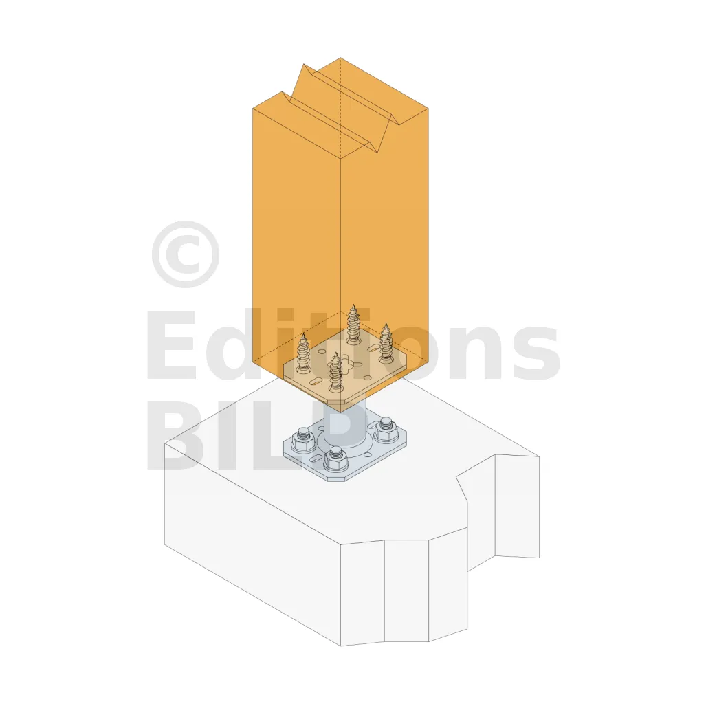 2. Fixer cette platine au poteau à l’aide de tirefonds LAG (Pré-perçage nécessaire)