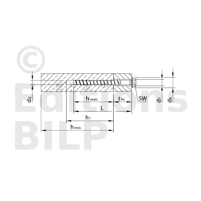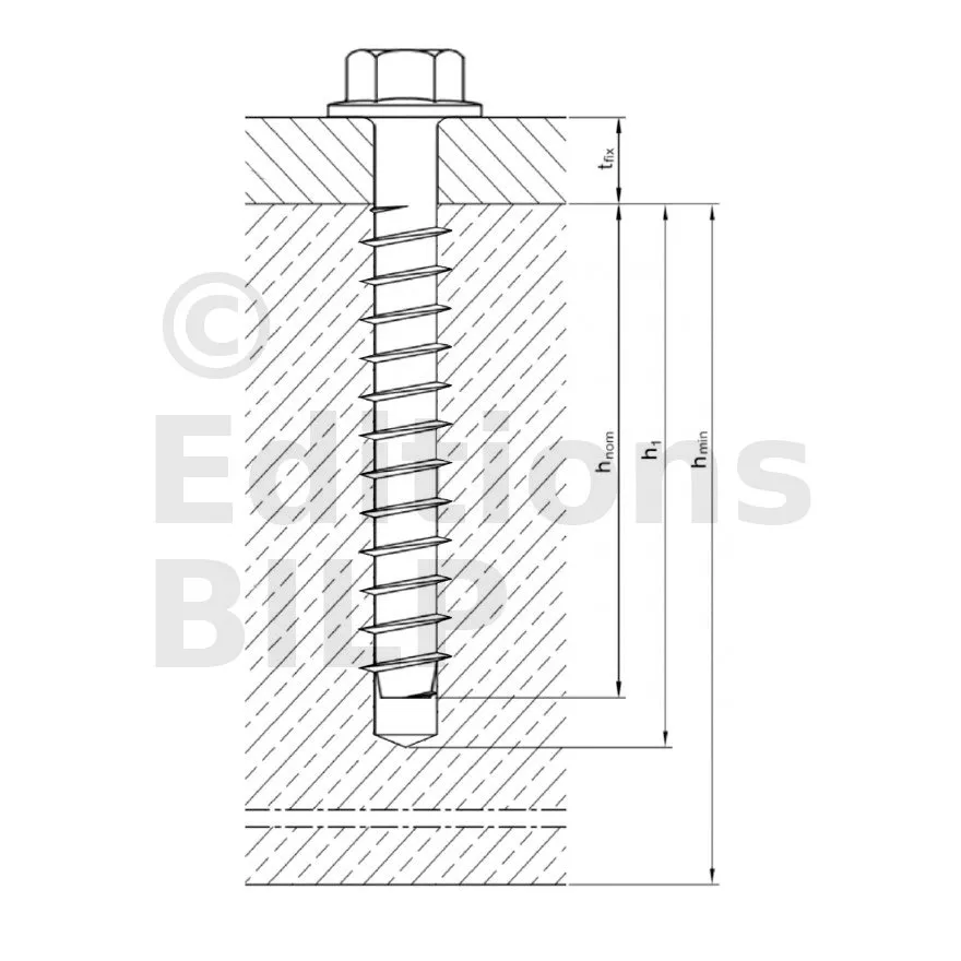 - Vis à insérer sans cheville dans un trou pré-percé. Le diamètre du foret pour le pré-perçage est indiqué dans la caractéristique "Diamètre nominal du foret, d0".