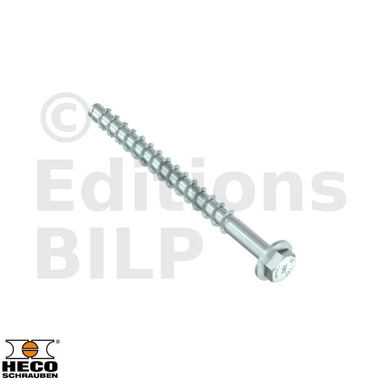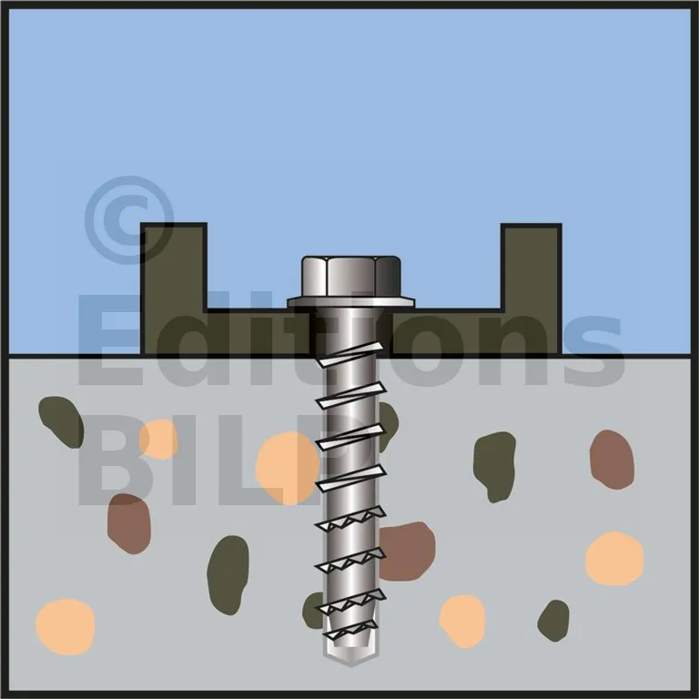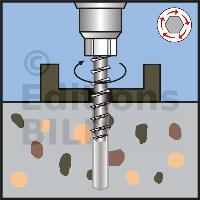 La vis béton à tête hexagonale avec embase est un système de fixation par verrouillage de forme pour charges lourdes dans le béton fissuré et non fissuré. Elle permet une mise en œuvre plus rapide que les chevilles standards pour des applications permanentes ou provisoires. Le filetage en dents de scie assure un accroche très performante.