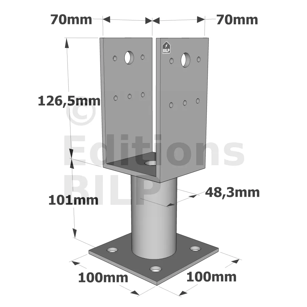 Ce pied de poteau en U avec platine permet de fixer un poteau sur une dalle béton tout en résistant à des efforts dans les 4 directions.