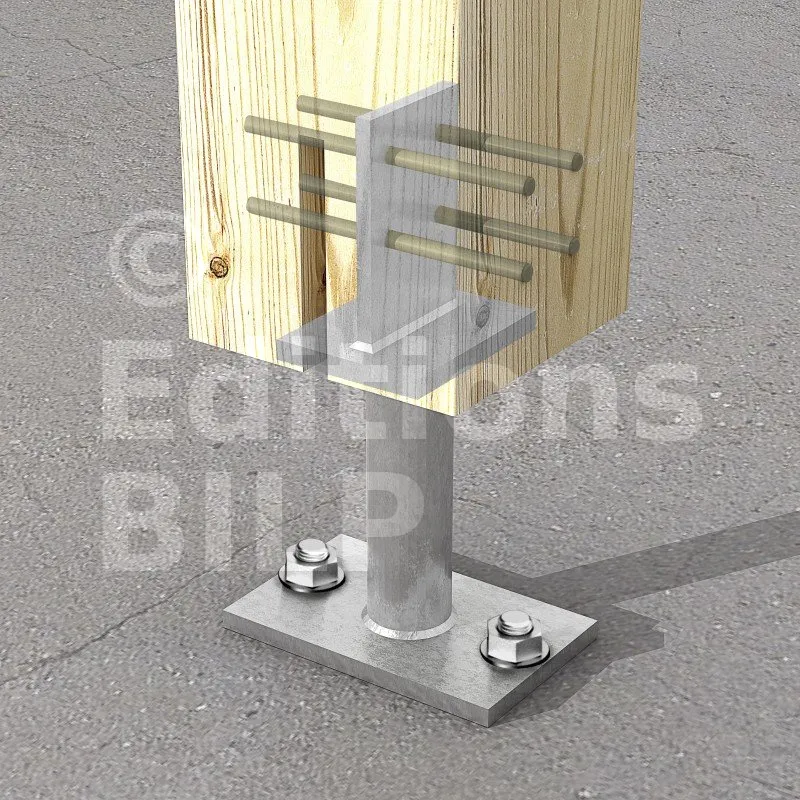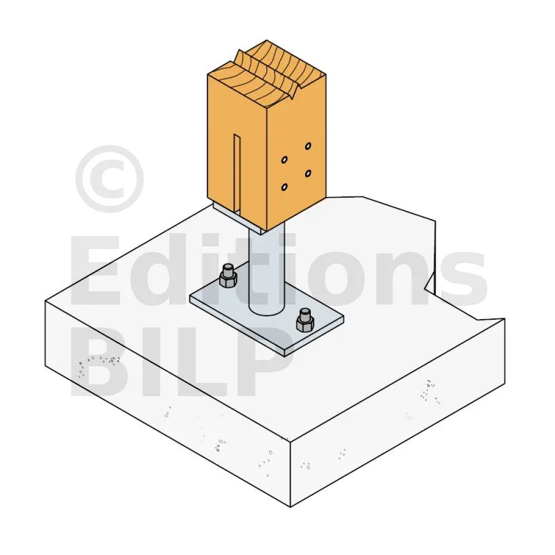 - Connexion bois sur support rigideSur poteau : 4Ø8 (broches STD) ; sur béton : 2Ø12 (goujons WA ; tige filetée)