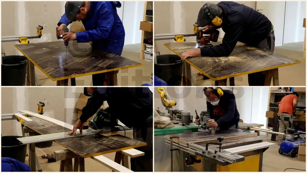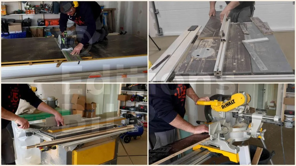 Les coupes dans le sens de la largeur se réalisent à la scie à onglets (idéalement radiale).