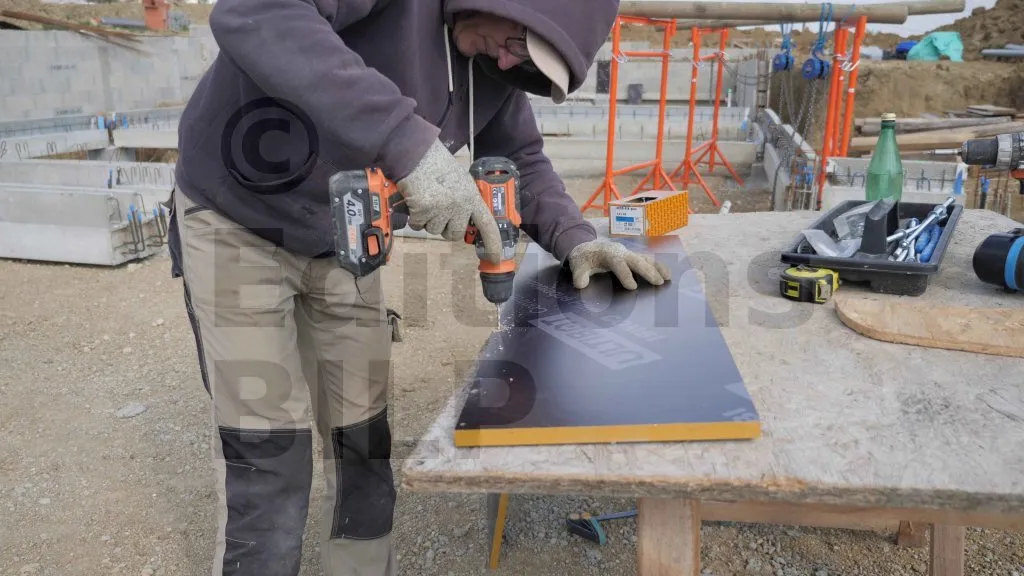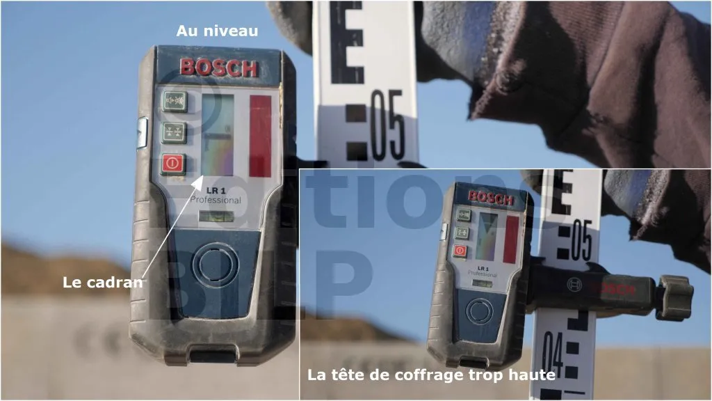 Une fois la deuxième planche en place, vérifiez le niveau des têtes de coffrage à l’aide d’un niveau laser et d’une cellule de réception laser. Ensuite, contrôlez l’horizontalité des têtes de coffrage et ajustez si nécessaire. Une fois les vérifications terminées, fixez définitivement les coffrages en serrant les écrous des tiges filetées. Ne serrez pas trop les écrous pour éviter de déformer les planches.