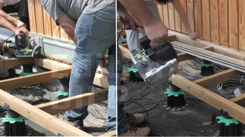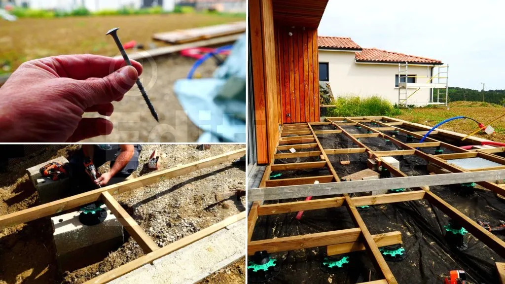 Découpez vos lambourdes secondaires à la longueur juste après traçage net, en gardant un jeu de dilatation de 3–5 mm en rives. L’entraxe peut aller jusqu’à 50–60 cm avec des sections très rigides comme pour la Maison BILP. N’oubliez pas qu’il faut toujours réaliser les aboutages sur appuis et jamais en porte-à-faux. Alignez au cordeau, puis vissez sur les têtes de plots avec des vis inox A2/A4 à la perceuse-visseuse, sans bloquer la dilatation. Un contrôle de planéité à chaque rangée signe une ossature tendue, rigide et parfaitement ventilée.