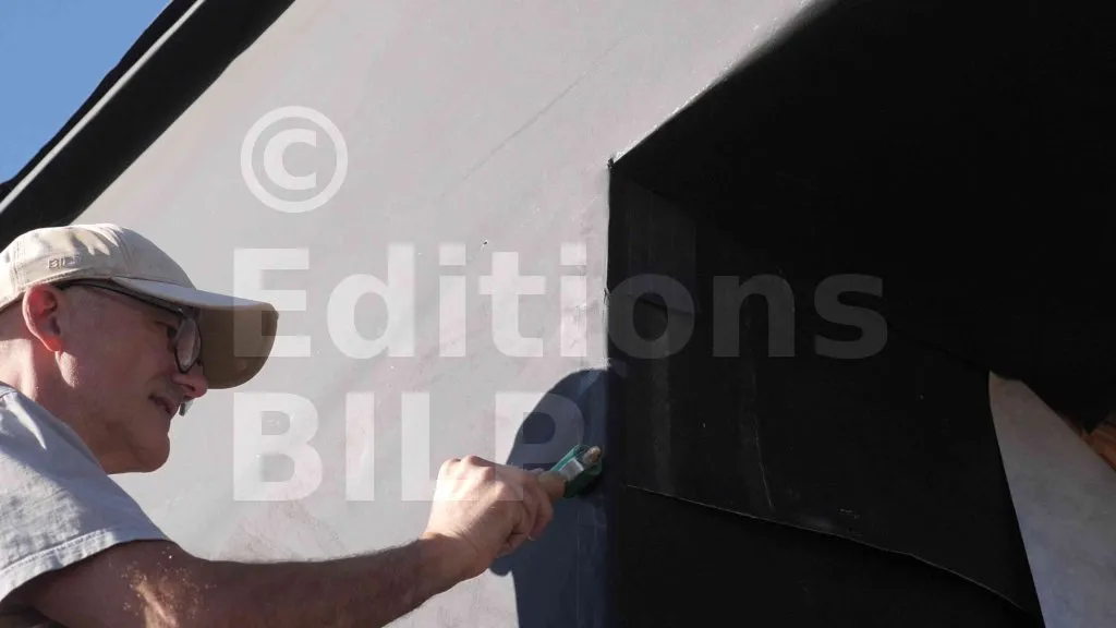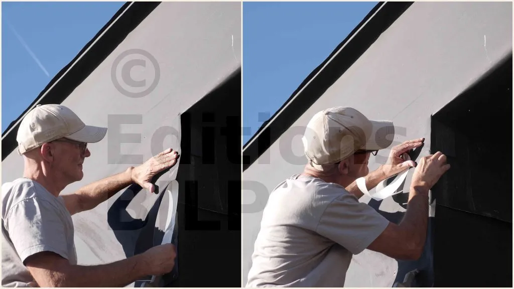 La bande périphérique, dotée d’un film de protection, est posée en retirant progressivement le film au fur et à mesure de l’avancement, tout en marouflant à la main pour assurer l’adhérence et chasser l’air. Une fois en place, la bande est rabattue vers l’intérieur afin de former le retour dans le tableau.