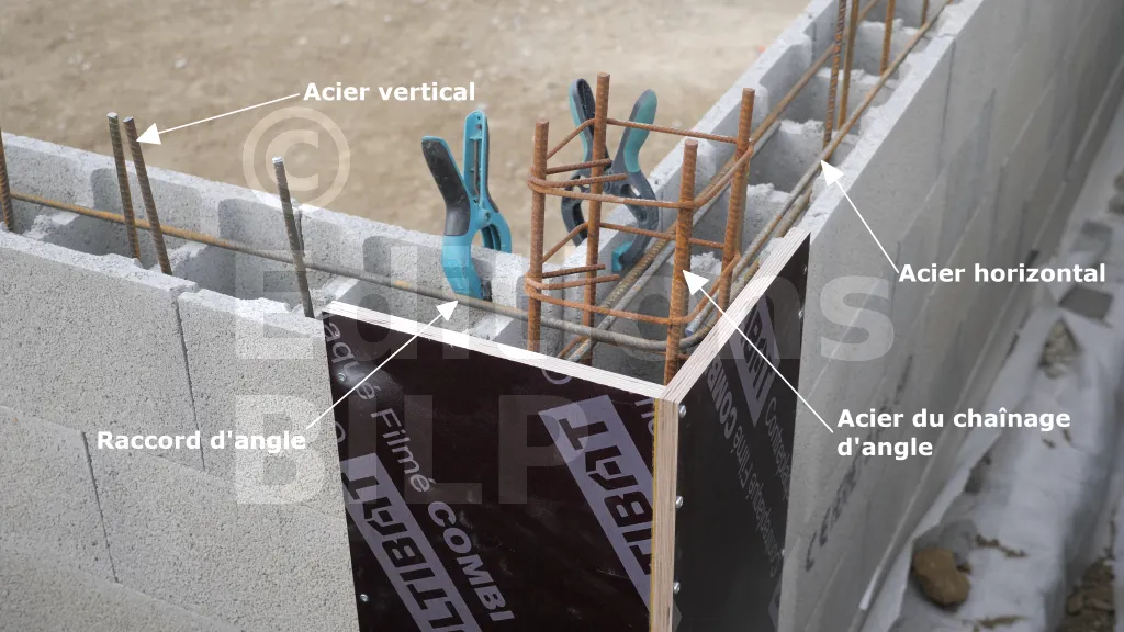 Le coulage des murs, des poteaux et des chaînages d’angle est réalisé en même temps. L’article "les coffrages" traite de la mise en œuvre de tous les coffrages pour la réalisation du mur de soubassement.