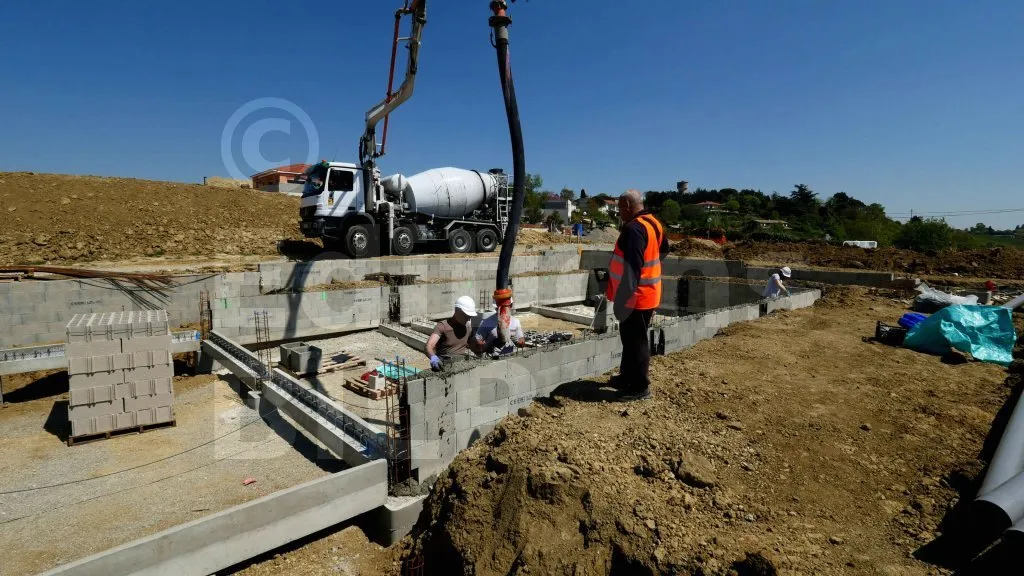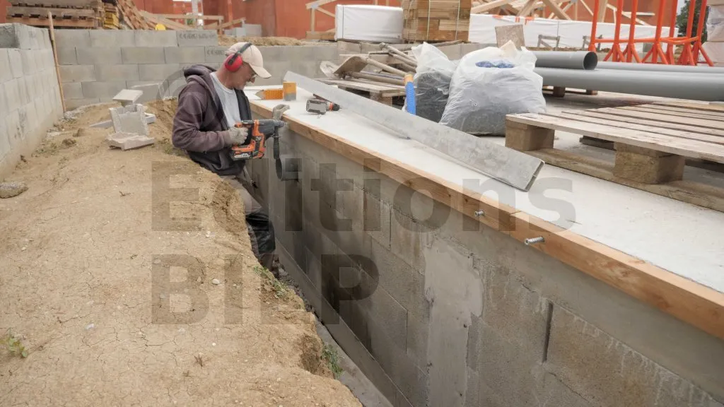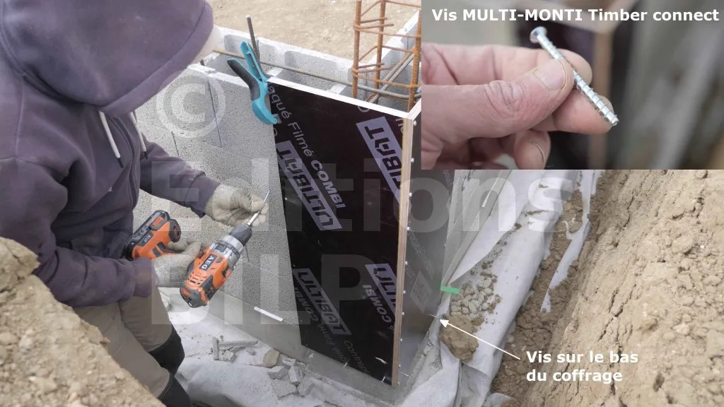 Le coulage des murs, des poteaux et des chaînages d’angle est réalisé en même temps. L’article "les coffrages" traite de la mise en œuvre de tous les coffrages pour la réalisation du mur de soubassement.
