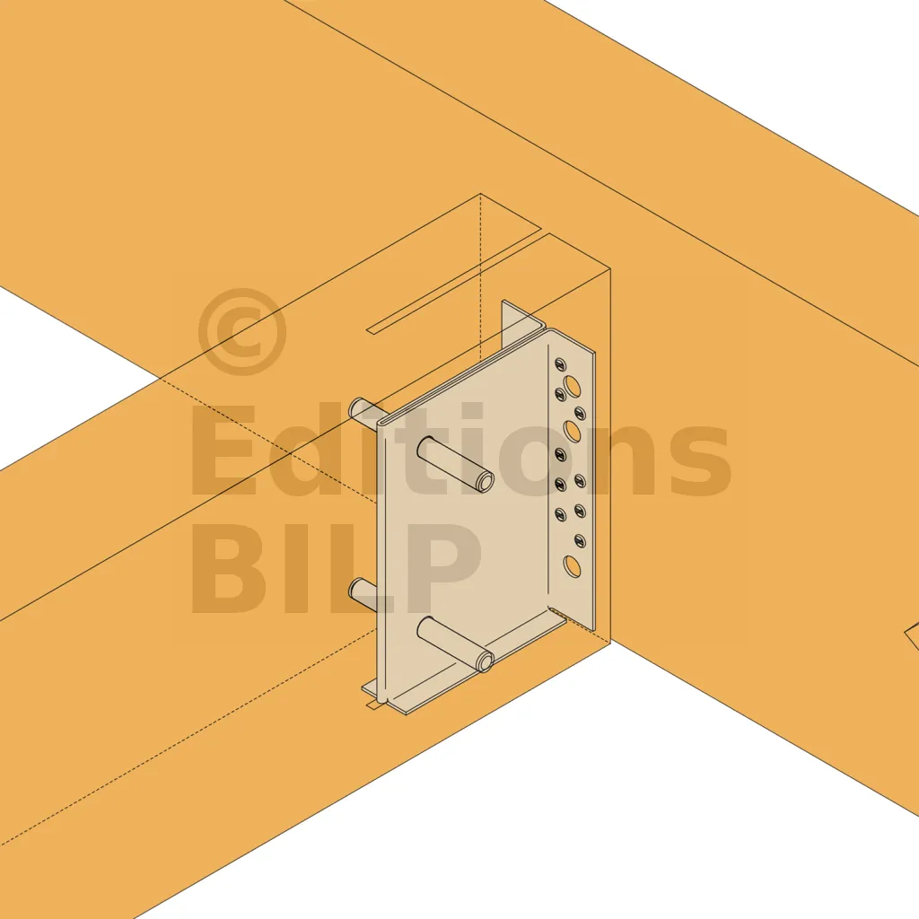 L‘étrier à âme intérieure permet un assemblage discret sur support bois. Le talon intérieur positionne l’étrier par rapport au bois facilitant le montage des broches.