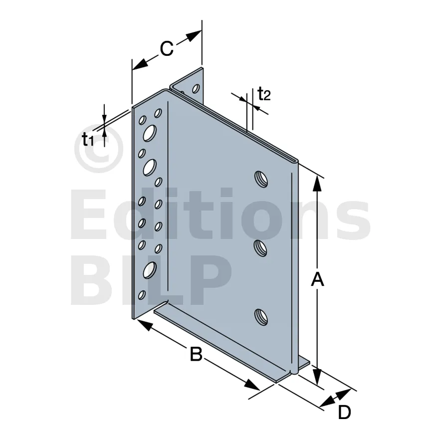 | Largeur | Hauteur | Largeur poteau | Hauteur (A) | Profondeur (B) | largeur (C) | largeur (D) | Epaisseur (t1) | Epaisseur (t2) | Ø13 | Ø5 | Ø13 | ||