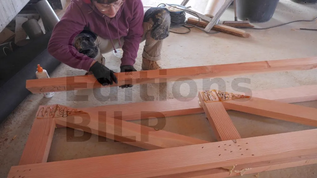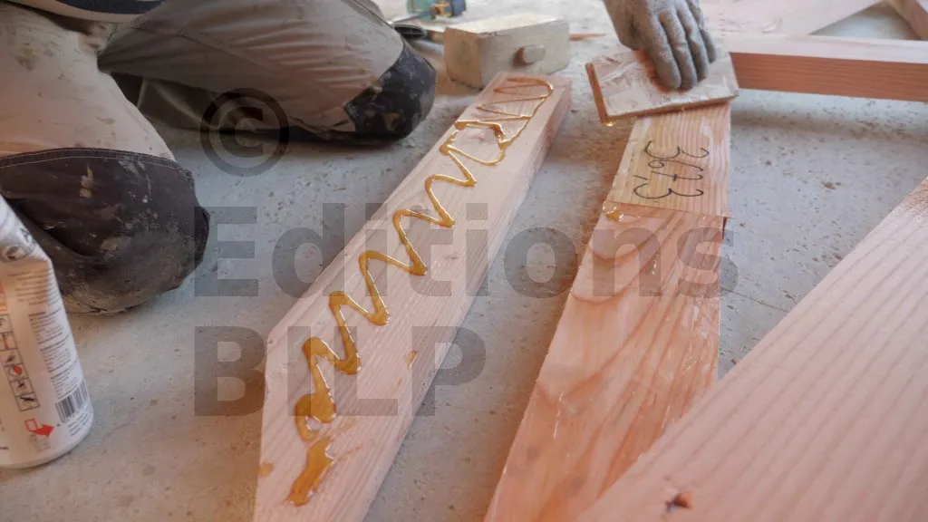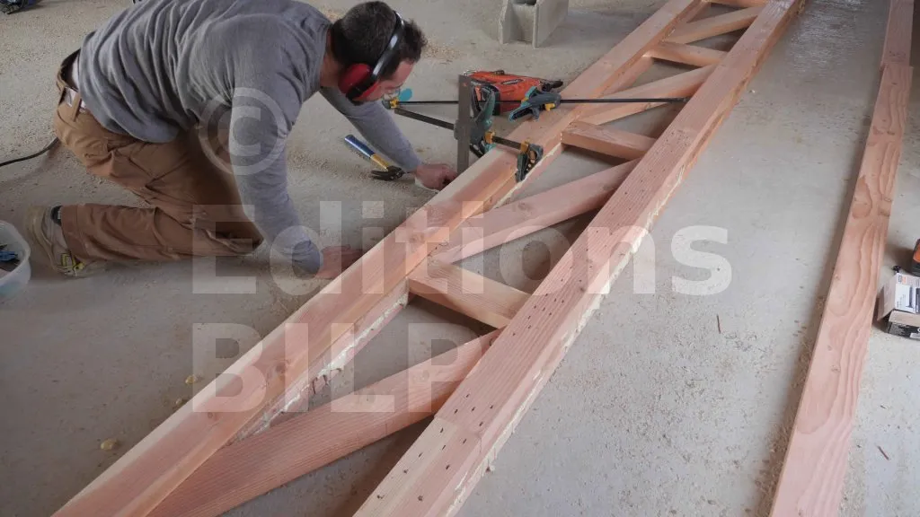Avant que la colle ne sèche, il faut vérifier la planéité de la base du treillis. Cette opération est nécessaire pour faciliter le réglage de l’aplomb des treillis lors de la pose. Les membrures sont maintenues avec des serre-joints jusqu’à ce que la colle soit sèche.