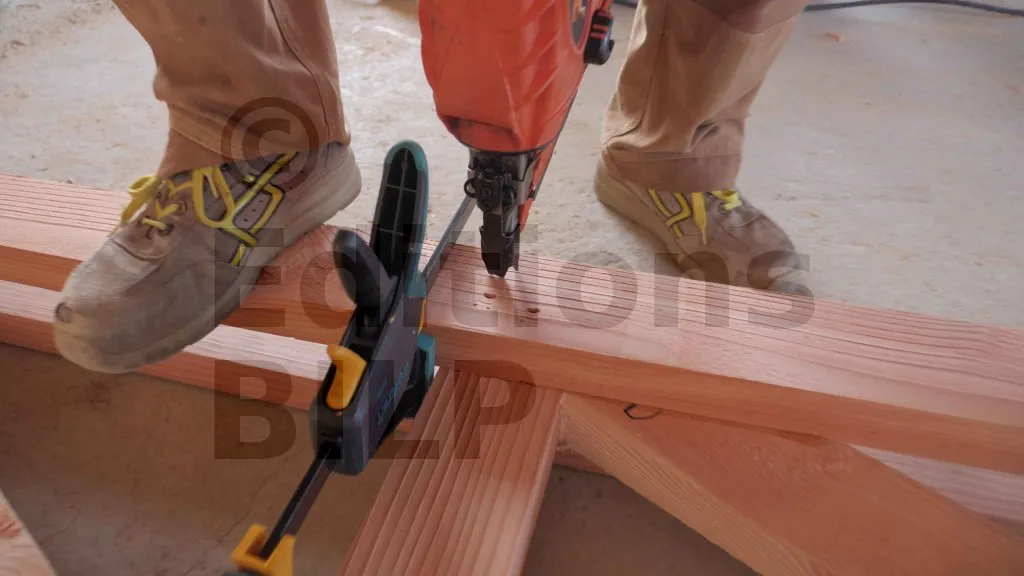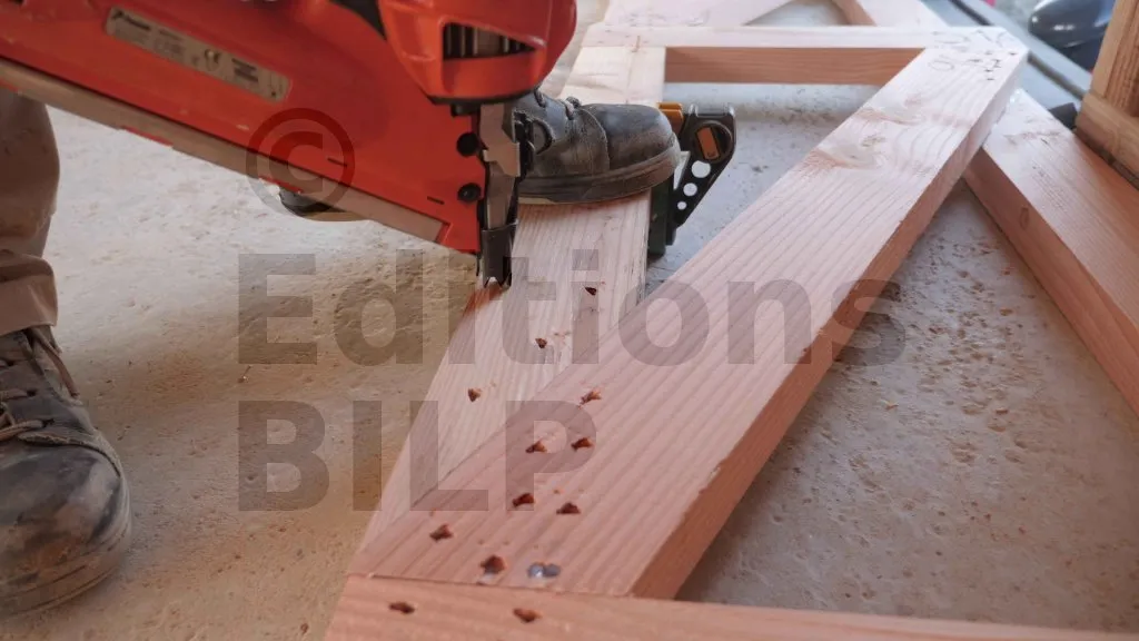 Les pièces d’assemblage doivent être maintenues avec des serre-joints jusqu’à ce que la colle soit sèche. En plus de l’encollage, la fixation est renforcée avec des clous disposés en quinconce sur toute sa surface.