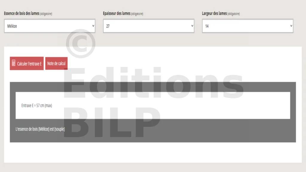 - Pour déterminer l’entraxe des lambourdes, on va utiliser l’outil de calcul et de dimensionnement des entraxes. Les caractéristiques des lames utilisées vont permettre de la déterminer, c’est-à-dire la section et l’essence de bois utilisé. On obtient alors une entraxe de 57 cm maximum.