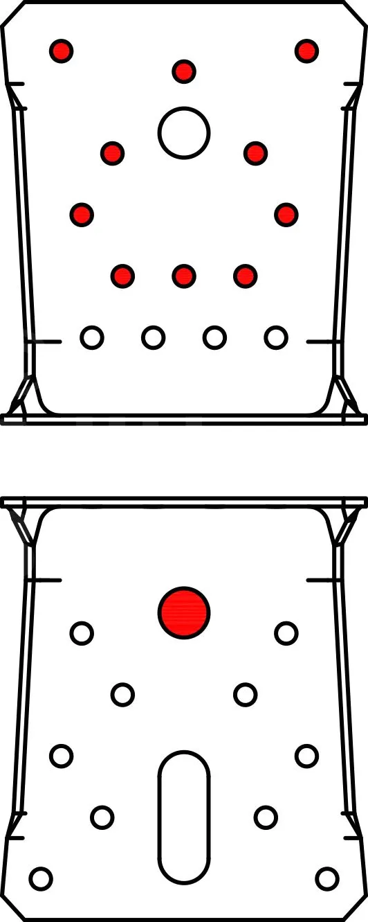 - Fixation BOIS/BOIS - clouage totalAile A : 10 ; Aile B : 14 ; type : Pointes annelées CNA Ø4.0x35 ou Ø4.0x50 mm, Vis CSA Ø5.0x35 ou CSA Ø5.0x40