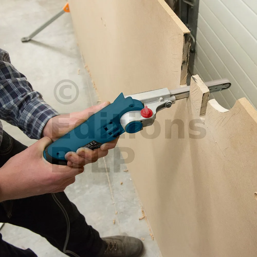 Équipée du contrôle de vitesse variable par une molette facile d’accès, vous pouvez choisir et changer la vitesse de rotation de la bande pour obtenir un débit de ponçage spécifique en fonction de la finition voulue, et selon la tâche et le matériau sur lequel vous travaillez. Sur la base du bras de la lime, se trouve une vis de tension/relâche qui tend ou détend la bande pour améliorer la performance, ainsi que de faciliter le retrait et le changement de la bande.