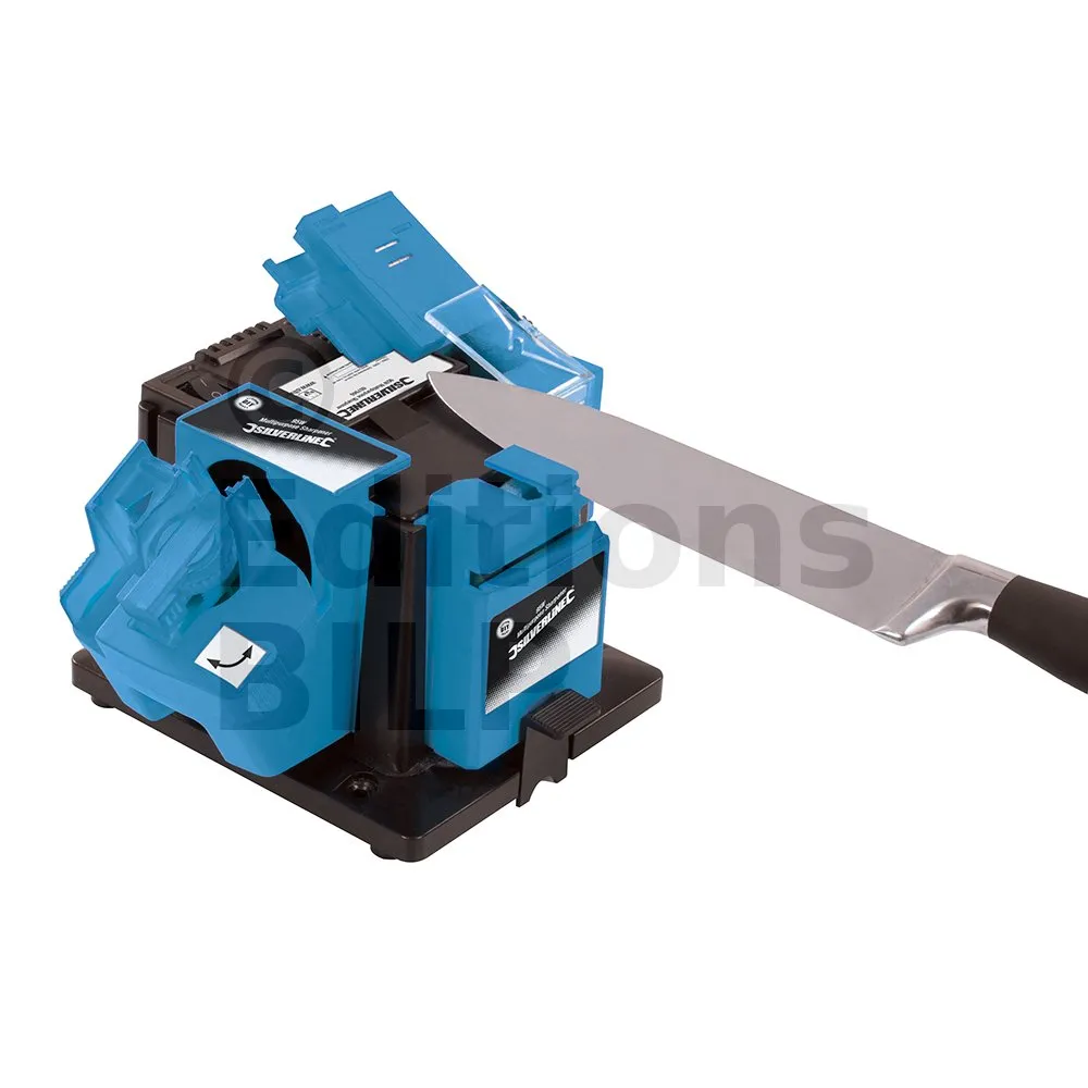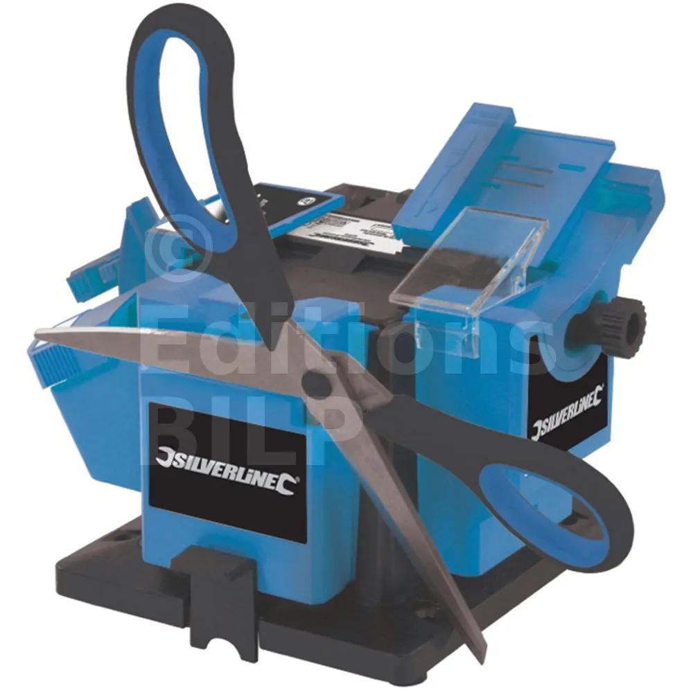 Appareil spécialement conçu pour réaliser l’affûtage de forets en acier HSS (acier rapide), burins, couteaux, ciseaux, fers de rabots, et autres lames. Comprend des gabarits afin d’obtenir un réglage de l’angle d’affûtage d’une grande précision. Garantit un affûtage rapide et soigné. Pour mèches en acier HSS (acier rapide) de 3 à 13 mm de diamètre et pour lames de 6 à 51 mm de largeur. Polyvalent et facile d’utilisation. Disques de meulage de rechange disponibles.