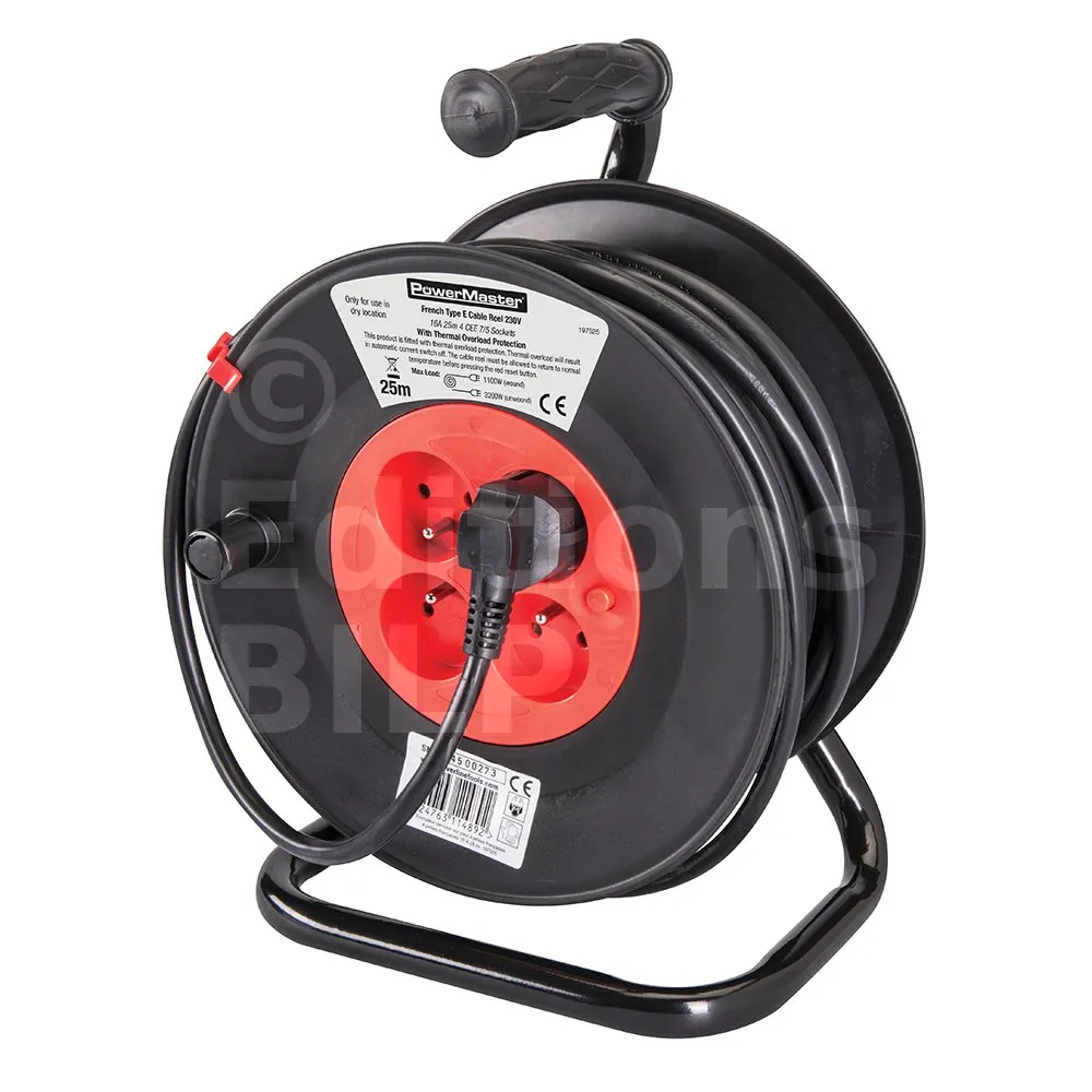 Protection anti-surcharge et bouton de réinitialisation. Facile à dérouler grâce à sa poignée. Base stable et robuste. Comprend 4 prises européennes de type E (CEE 7/5) et prise Schuko (CEE 7/7). Intensité maximale de 16 A. Pour brancher des appareils jusqu’à une puissance cumulée de 3 000 W (toujours dérouler complètement le câble lorsque la puissance dépasse 1100 W). Pour les pays utilisant des prises de type E (par exemple la France, la Belgique, la Pologne, la République tchèque et la Slovaquie). Câble de 25 m de long, section de conducteur 3G 1,5 mm².