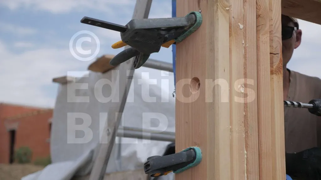 La longueur des boulons n’est pas suffisante pour traverser l’épaisseur des montants d’ossature. La solution que nous avons trouvée est de réaliser des trous borgnes sur les deux montants d’extrémités.