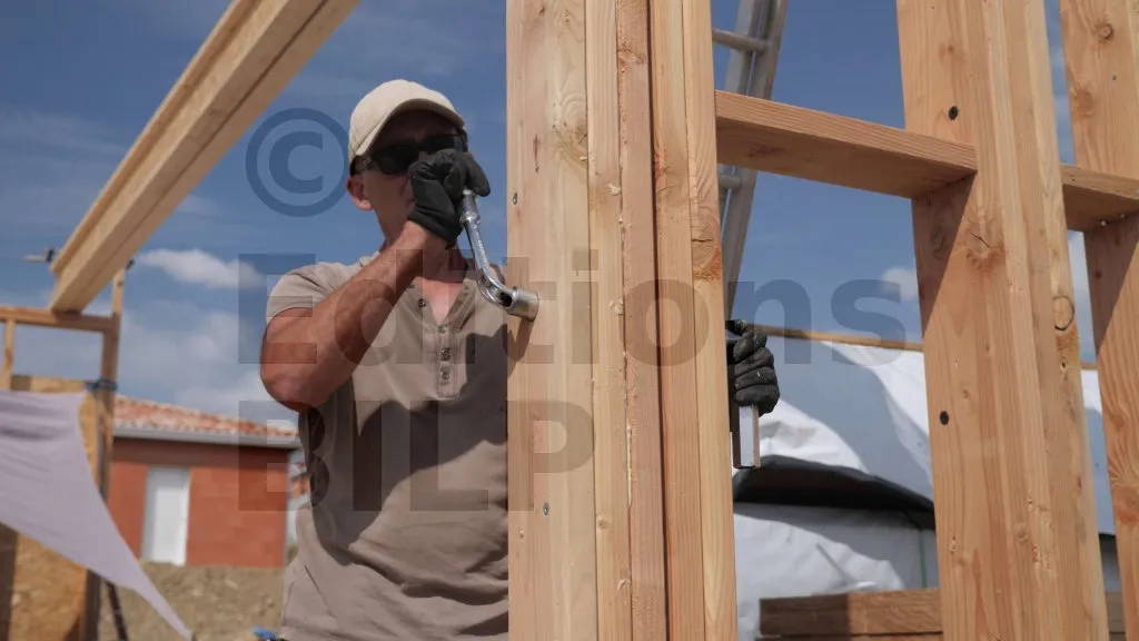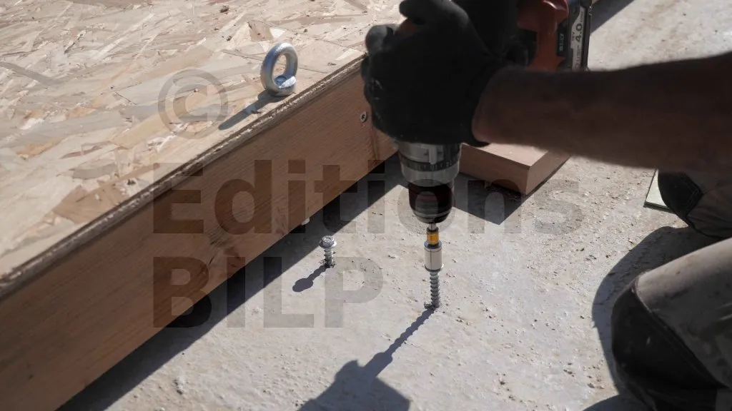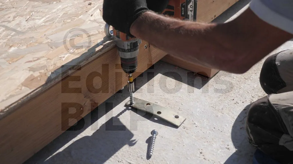 Les ossatures des murs sont fixées sur les lisses basses à l’aide de Vis TimberConnect et reliées entre elles par des boulons .