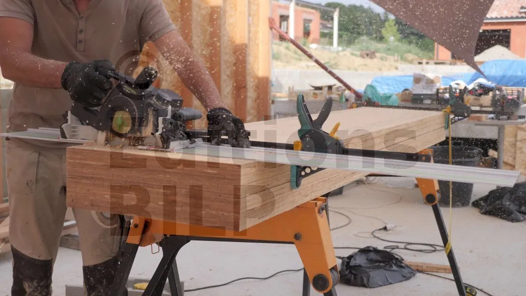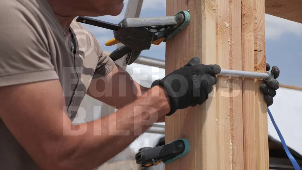 La coupe des pièces de bois est réalisée en une seule fois. Pour ce faire, maintenez l’ensemble des pièces de bois à l’aide de serre-joints, puis effectuez en une seule fois l’ajustage de la longueur des pièces avec une scie à chaîne équipée d’un guide.