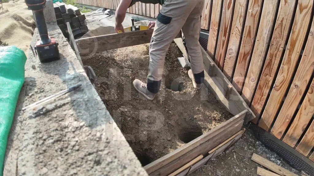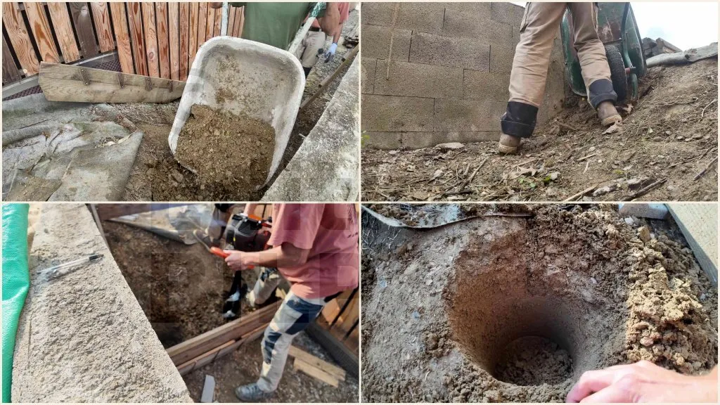 La préparation consiste à mettre en forme le sol avant la mise en place de l’escalier : mise en pente, réglage des niveaux et stabilisation du sol support. La zone de l’escalier est préalablement dégagée en retirant les gravats, les racines et les terres meubles, puis le terrain est mis en pente et compacté soigneusement afin d’obtenir une base stable. Pour ce type d’escalier, des para-fouilles sont généralement prévues en pied et en tête afin de limiter les risques de glissement ou de basculement. Dans le cas présent, une solution alternative est mise en œuvre : de petits puits cylindriques sont réalisés à la tarière jusqu’au sol porteur, puis remplis de béton lors du coulage pour constituer des plots d’ancrage solidaires de la paillasse, assurant ainsi la stabilité de l’escalier et la pérennité de l’ouvrage.