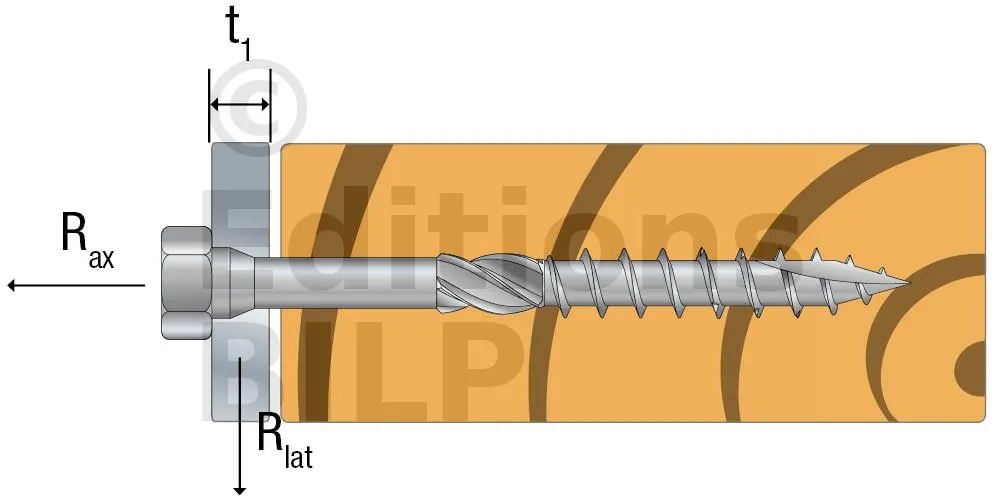 - Vis SSH installée avec un fraisage, perpendiculairement à la fibre du bois, et sollicitée avec un angle.