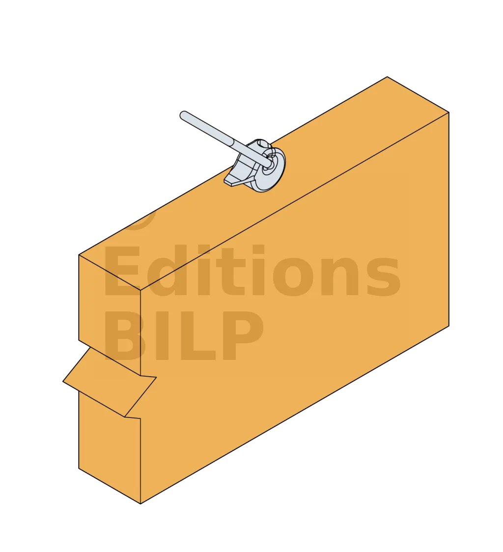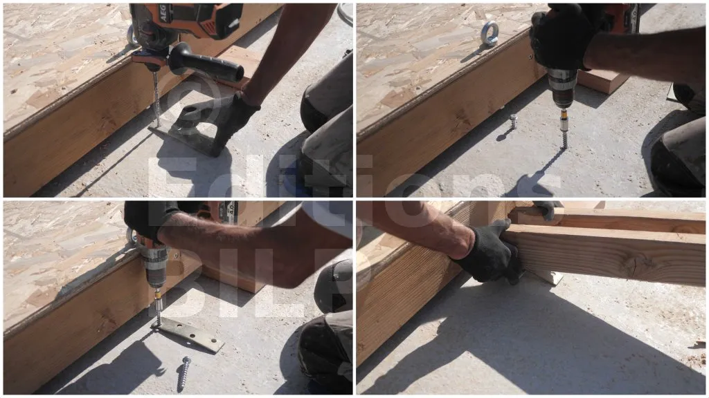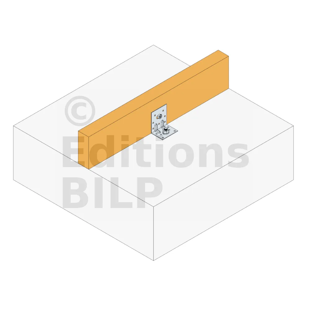 Le pied du lève-mur est fixé sur la dalle du plancher à l’aide de deux vis et d’une platine. D’abord, la platine est placée sur la dalle à une distance d’au moins égale à la hauteur des murs par rapport au lisses basses, pour la Maison BILP c’est 3,50 m. Ensuite, les points de vissage sont pré-percés avec une perceuse. Puis, la platine est mise en place en vissant une première extrémité. Enfin, le pied et placée entre la dalle et la platine et cette dernière est fixée en mettant en place le deuxième vis.