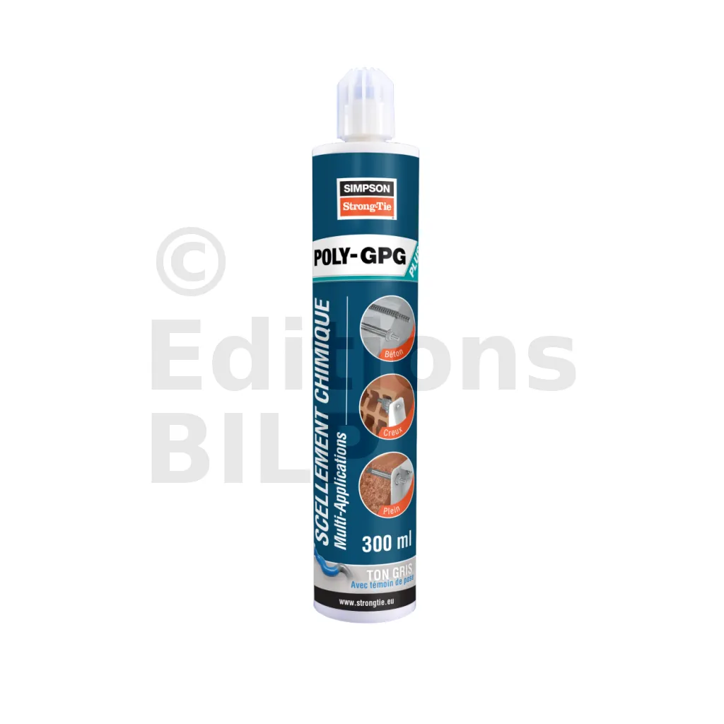 La résine multi-applications POLY-GPG Plus est préconisée pour la fixation de fers à béton, tiges filetées dans le béton non fissuré et dans les maçonneries creuses et pleines.